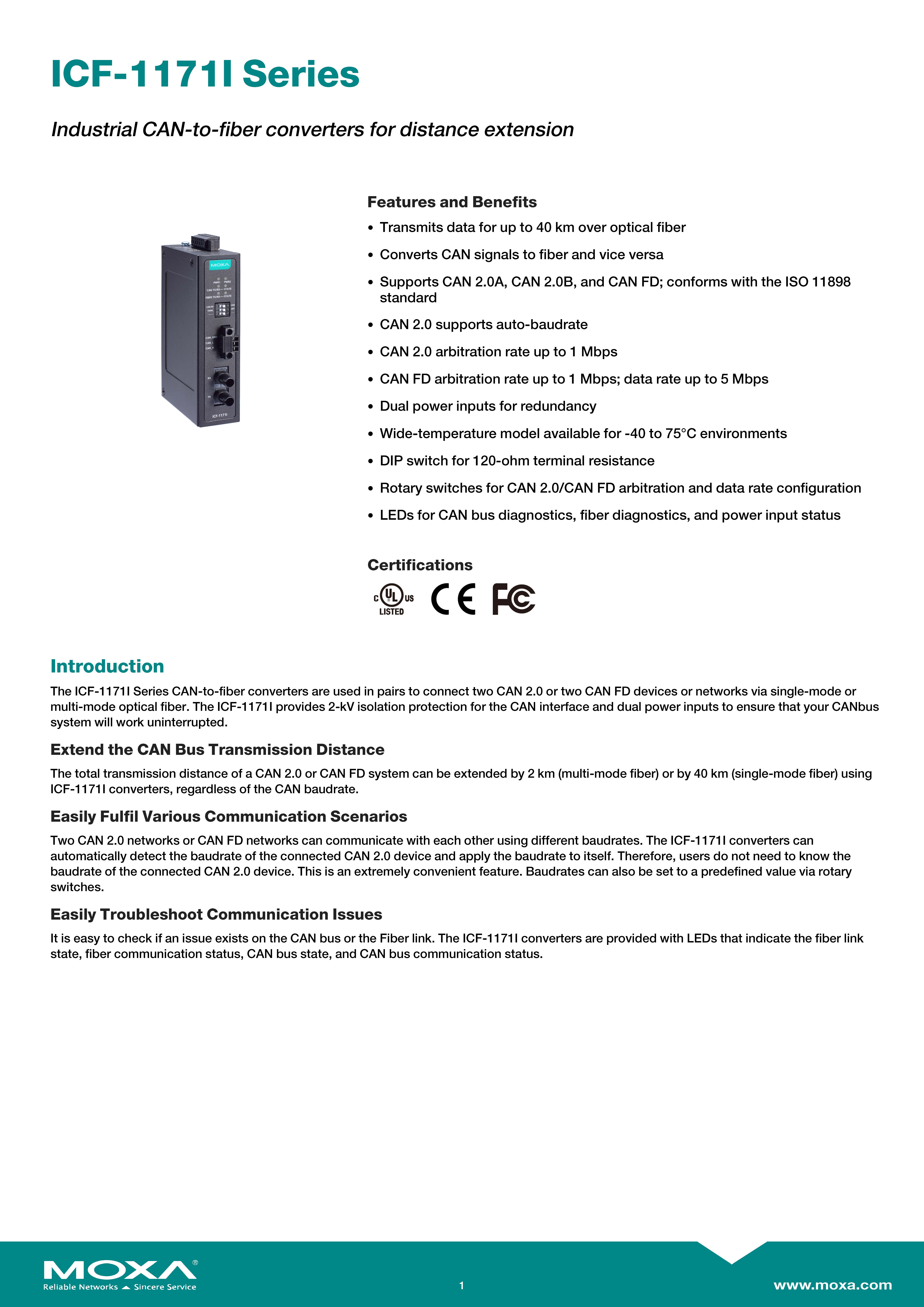 สินค้ายี่ห้อ MOXA รุ่น ICF-1171I-M-ST รายละเอียดสินค้า อุปกรณ์แปลงสัญญาณ CAN Bus เป็นใยแก้วนำแสง (Fiber Optic) เกรดอุตสาหกรรม สำหรับการขยายระยะทาง เชื่อมต่อด้วยหัว ST ชนิด Multi-mode ✅ ขอราคาพิเศษสำหรับงานโครงการติดต่อ Mobile : 063-879-9917Line ID : @aimonline