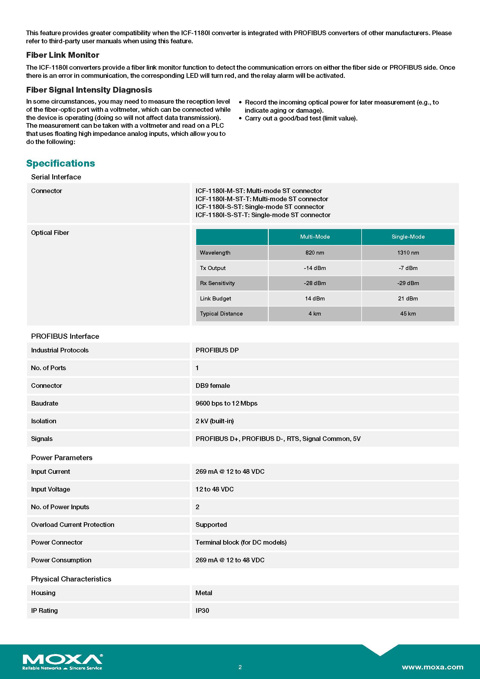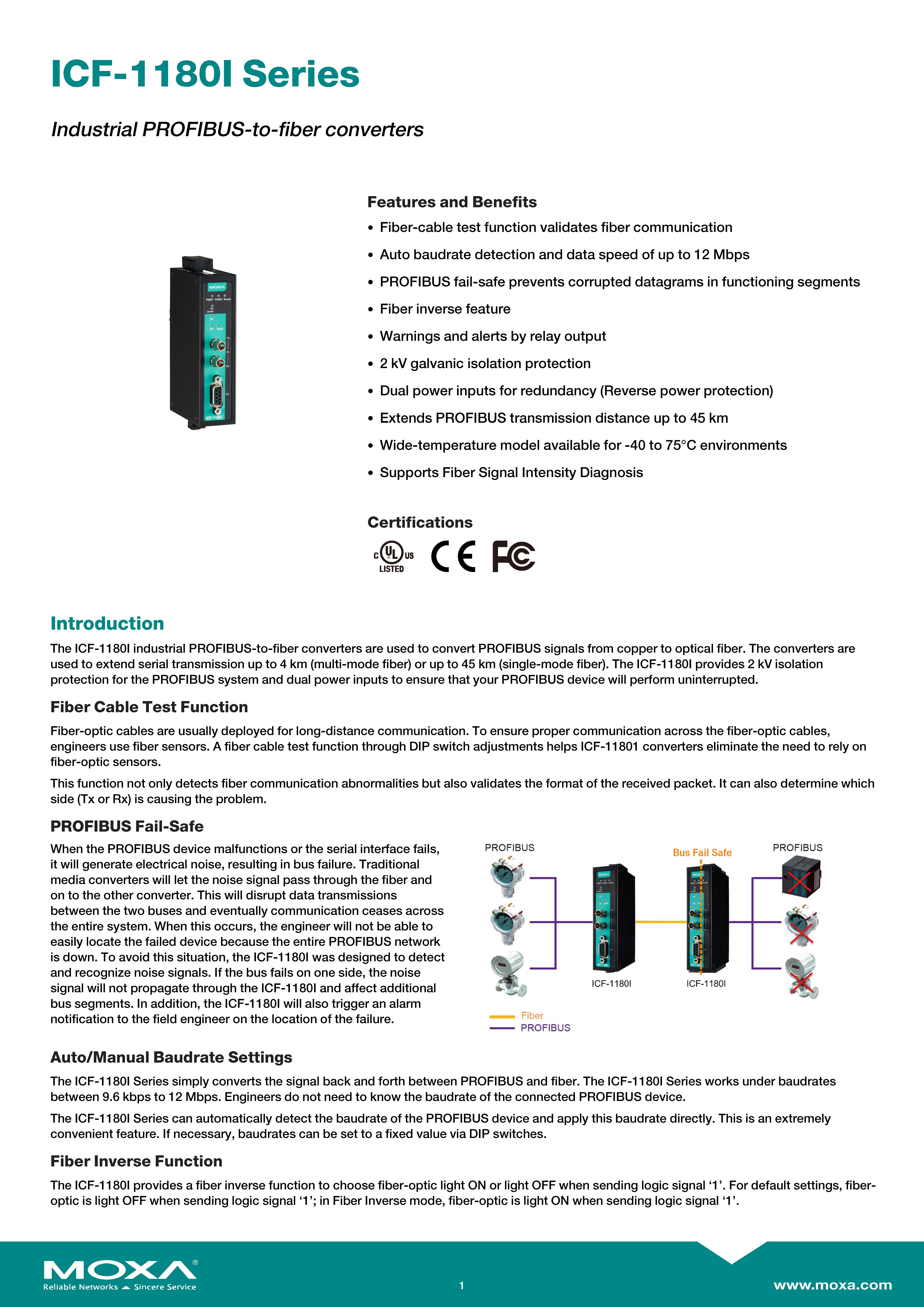 สินค้ายี่ห้อ MOXA รุ่น ICF-1180I-M-ST รายละเอียดสินค้า อุปกรณ์แปลงสัญญาณ PROFIBUS เป็นใยแก้วนำแสง (Fiber Optic) เกรดอุตสาหกรรม เชื่อมต่อด้วยหัว ST ชนิด Multi-mode ✅ ขอราคาพิเศษสำหรับงานโครงการติดต่อ Mobile : 063-879-9917Line ID : @aimonline