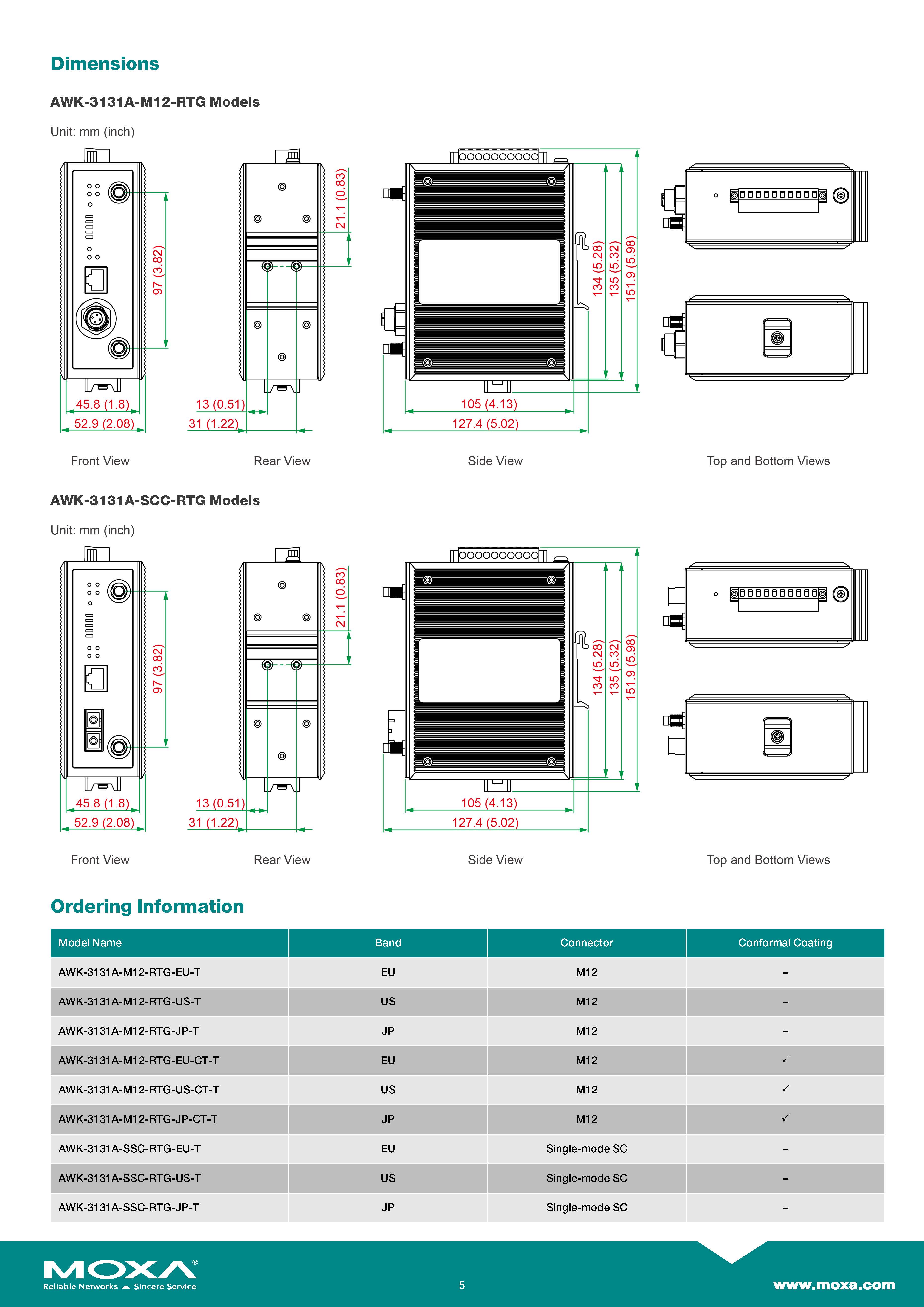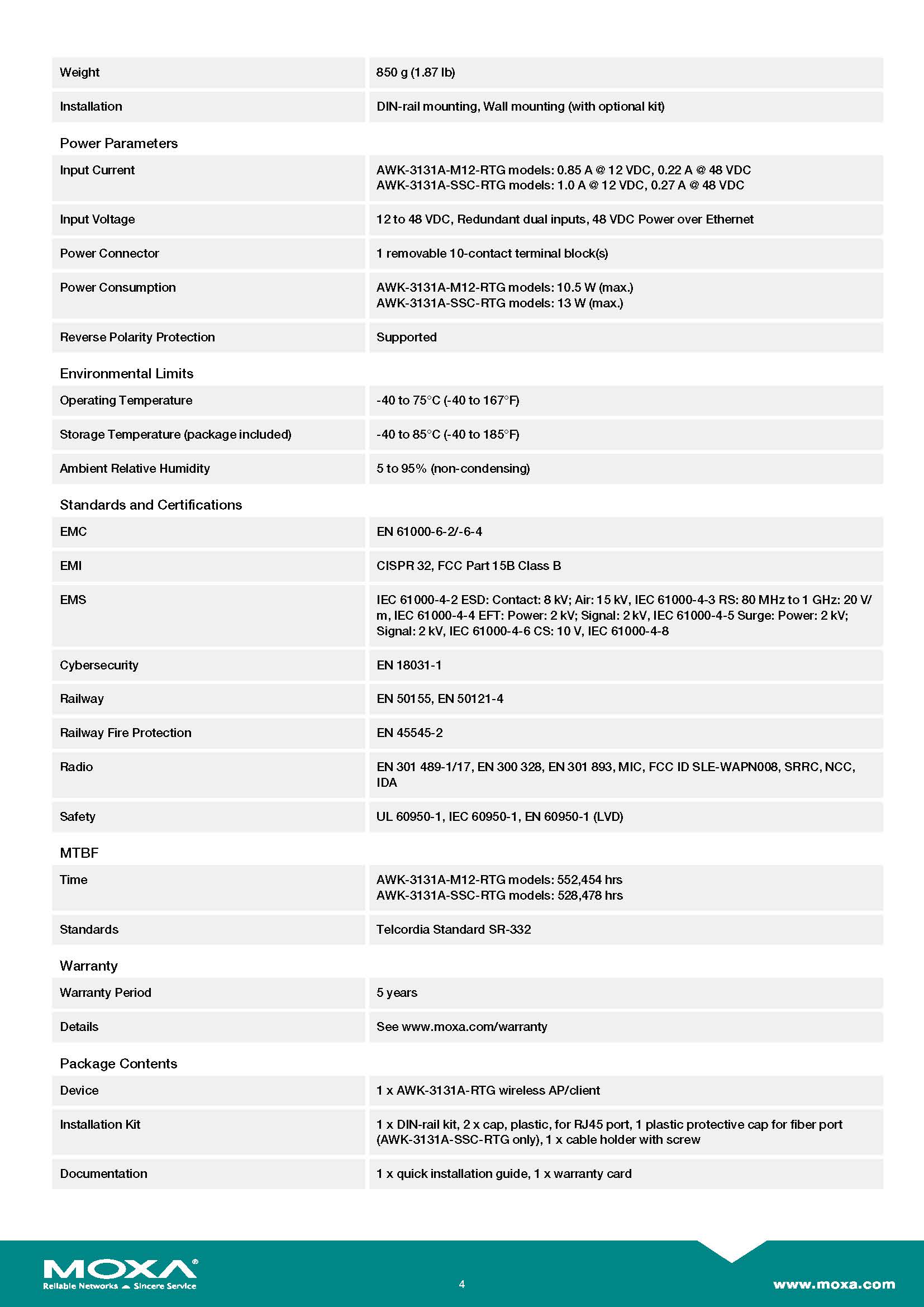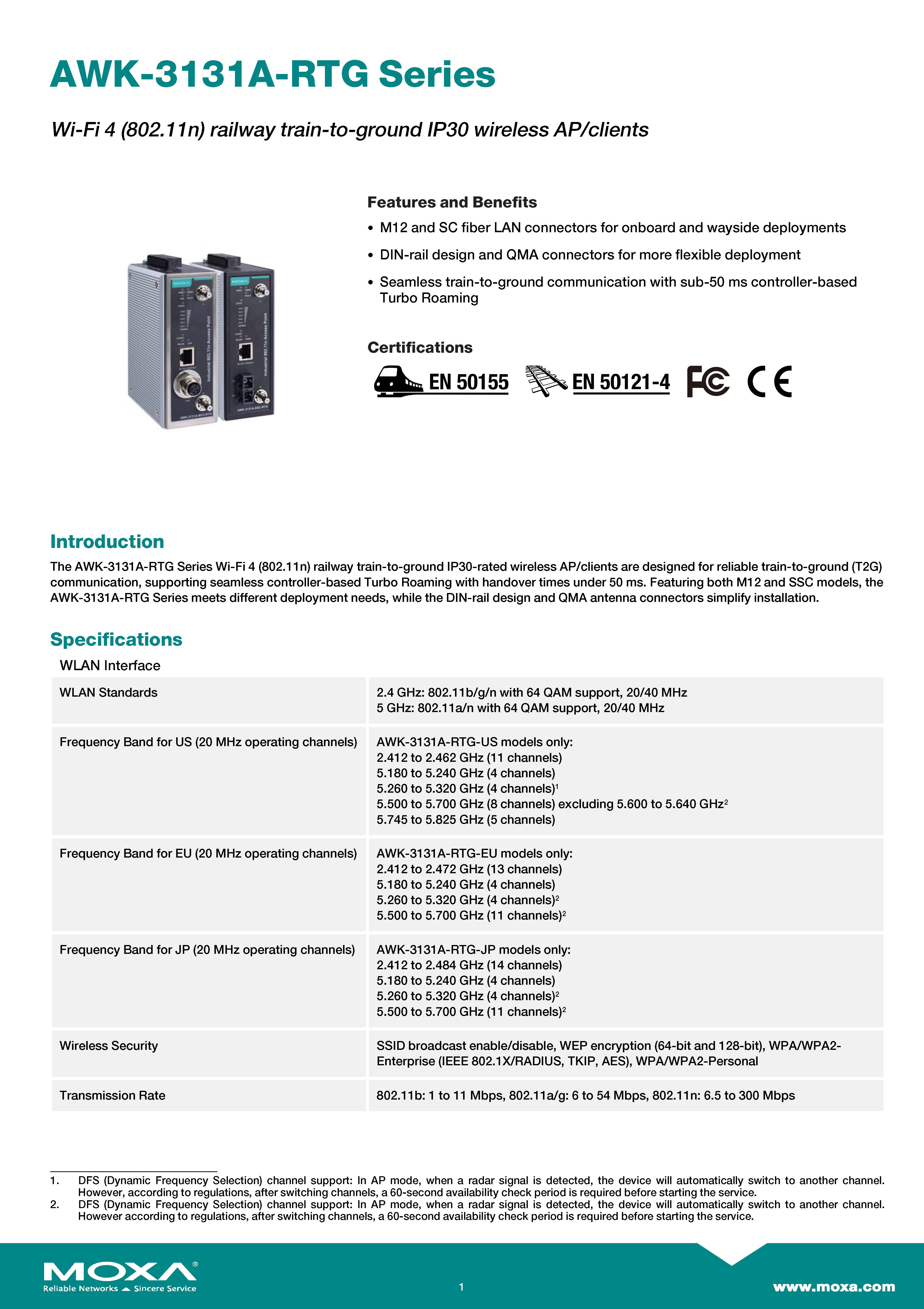 สินค้ายี่ห้อ MOXA รุ่น AWK-3131A-SSC-RTG-US-T รายละเอียดสินค้า "อุปกรณ์รับ-ส่งสัญญาณไร้สายเกรดอุตสาหกรรม" (Industrial Wireless AP/Bridge/Client) ✅ ขอราคาพิเศษสำหรับงานโครงการติดต่อ Mobile : 063-879-9917Line ID : @aimonline