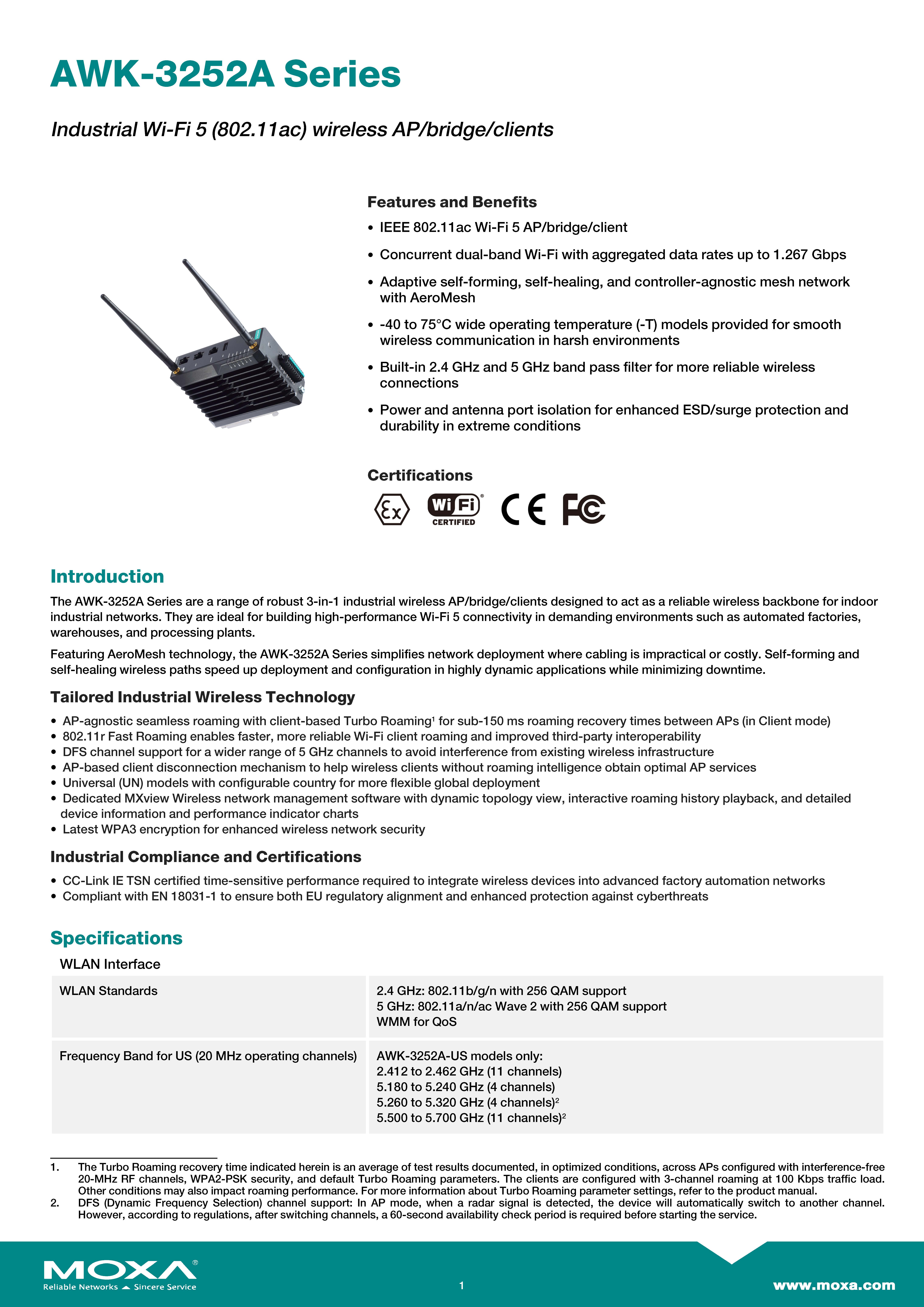 สินค้ายี่ห้อ MOXA รุ่น AWK-3252A-UN รายละเอียดสินค้า อุปกรณ์กระจายสัญญาณไร้สายเกรดอุตสาหกรรมแบบ 3-in-1 รองรับมาตรฐาน Wi-Fi 5 ความเร็วสูง พร้อมเทคโนโลยีสลับสัญญาณต่อเนื่องที่รวดเร็วสำหรับเครื่องจักรเคลื่อนที่ ตัวถังโลหะทนทานพิเศษและผ่านมาตรฐานความปลอดภัยทางไซเบอร์ เพื่อการใช้งานที่เสถียรที่สุดในสภาพแวดล้อมโรงงาน ✅ ขอราคาพิเศษสำหรับงานโครงการติดต่อ Mobile : 063-879-9917 Line ID @aimonline