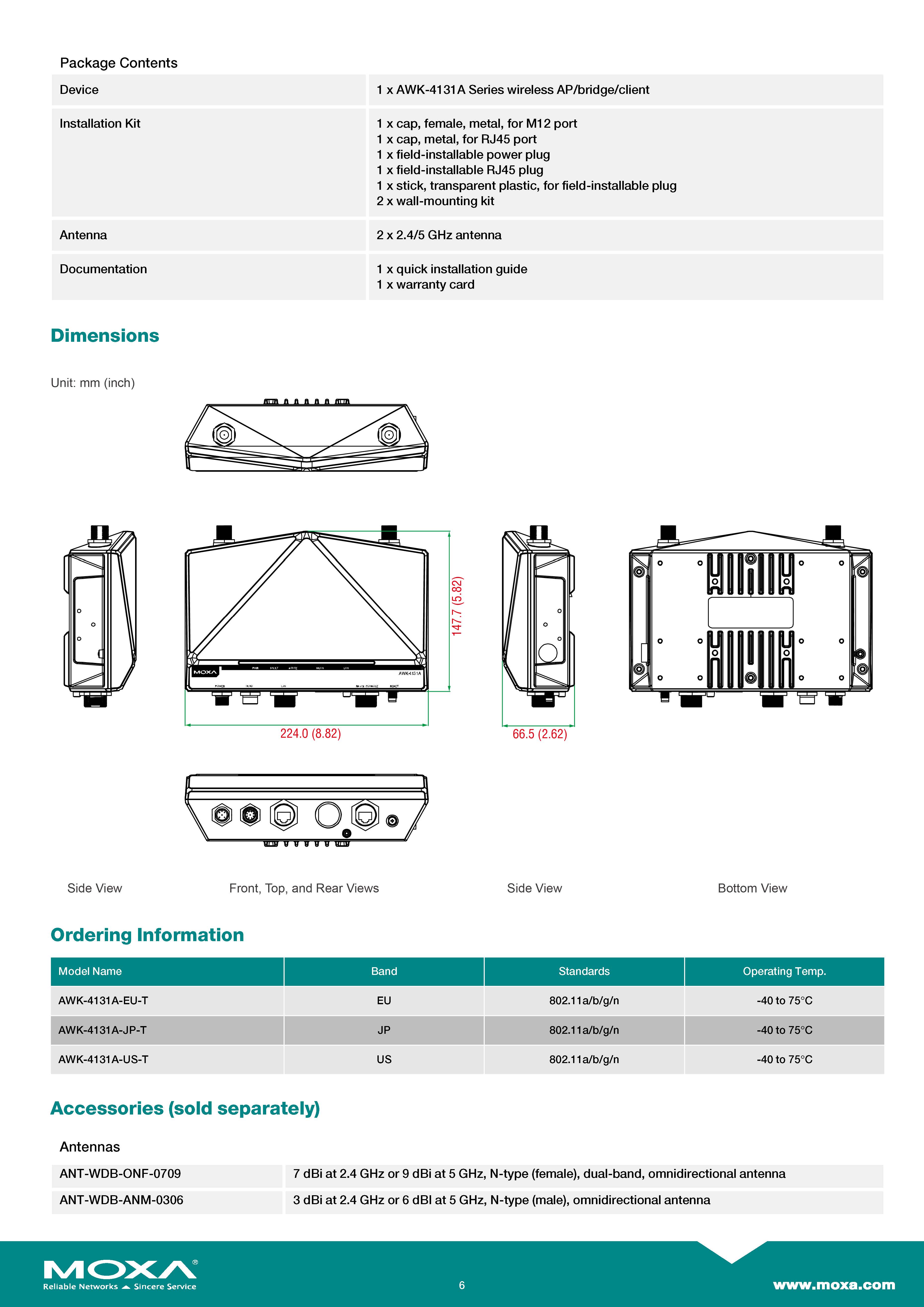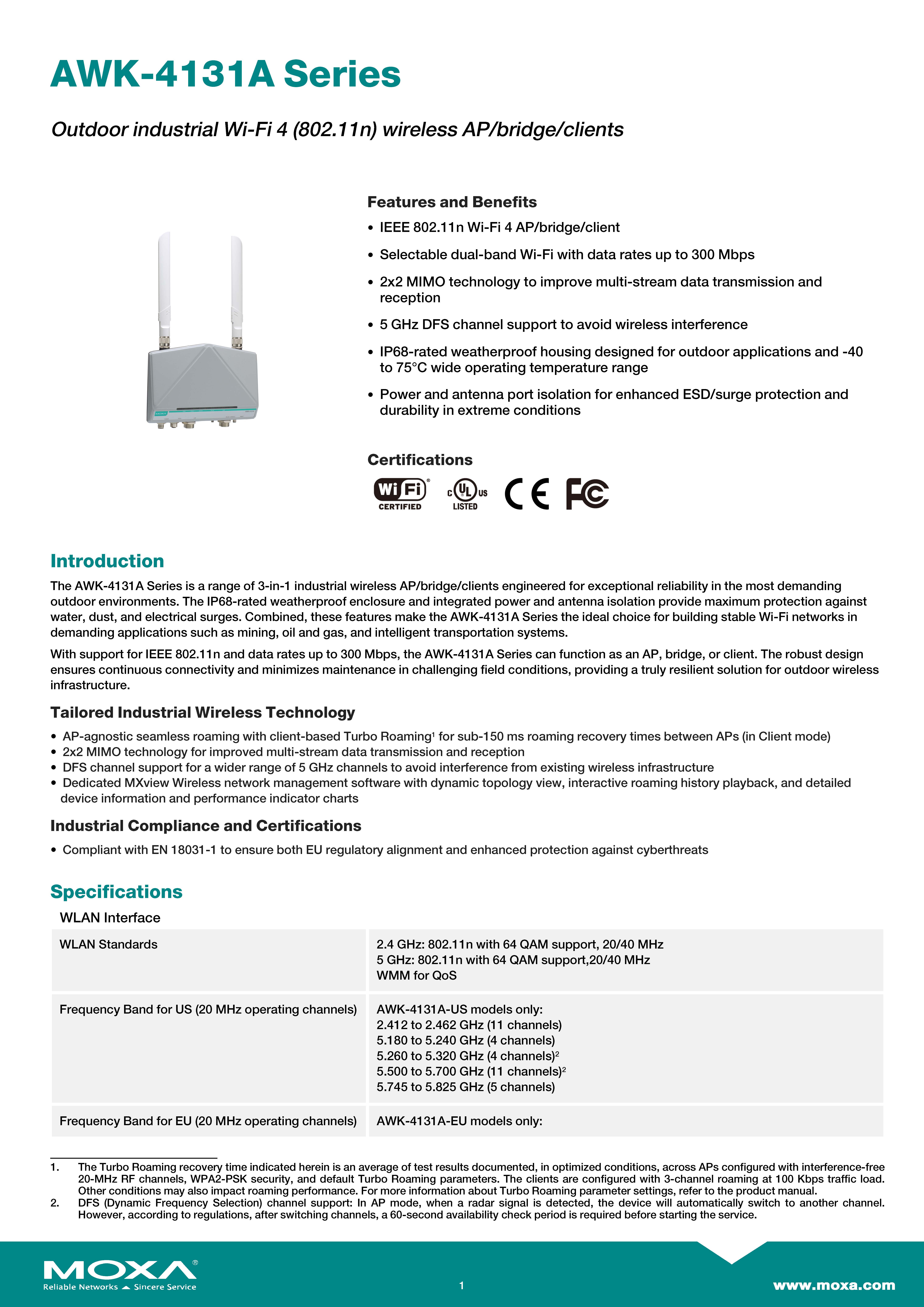 สินค้ายี่ห้อ MOXA รุ่น AWK-4131A-EU-T รายละเอียดสินค้า อุปกรณ์กระจายสัญญาณไร้สายภายนอกอาคาร (Outdoor) เกรดอุตสาหกรรม มาตรฐานกันน้ำกันฝุ่นสูงสุด IP68 ออกแบบมาให้ทนทานต่อสภาพอากาศเลวร้ายและอุณหภูมิช่วงกว้าง (-40 ถึง 75°C) พร้อมเทคโนโลยี Turbo Roaming เพื่อการเชื่อมต่อที่เสถียรที่สุดสำหรับงานภาคสนามและระบบขนส่ง ✅ ขอราคาพิเศษสำหรับงานโครงการติดต่อ Mobile : 063-879-9917 Line ID @aimonline