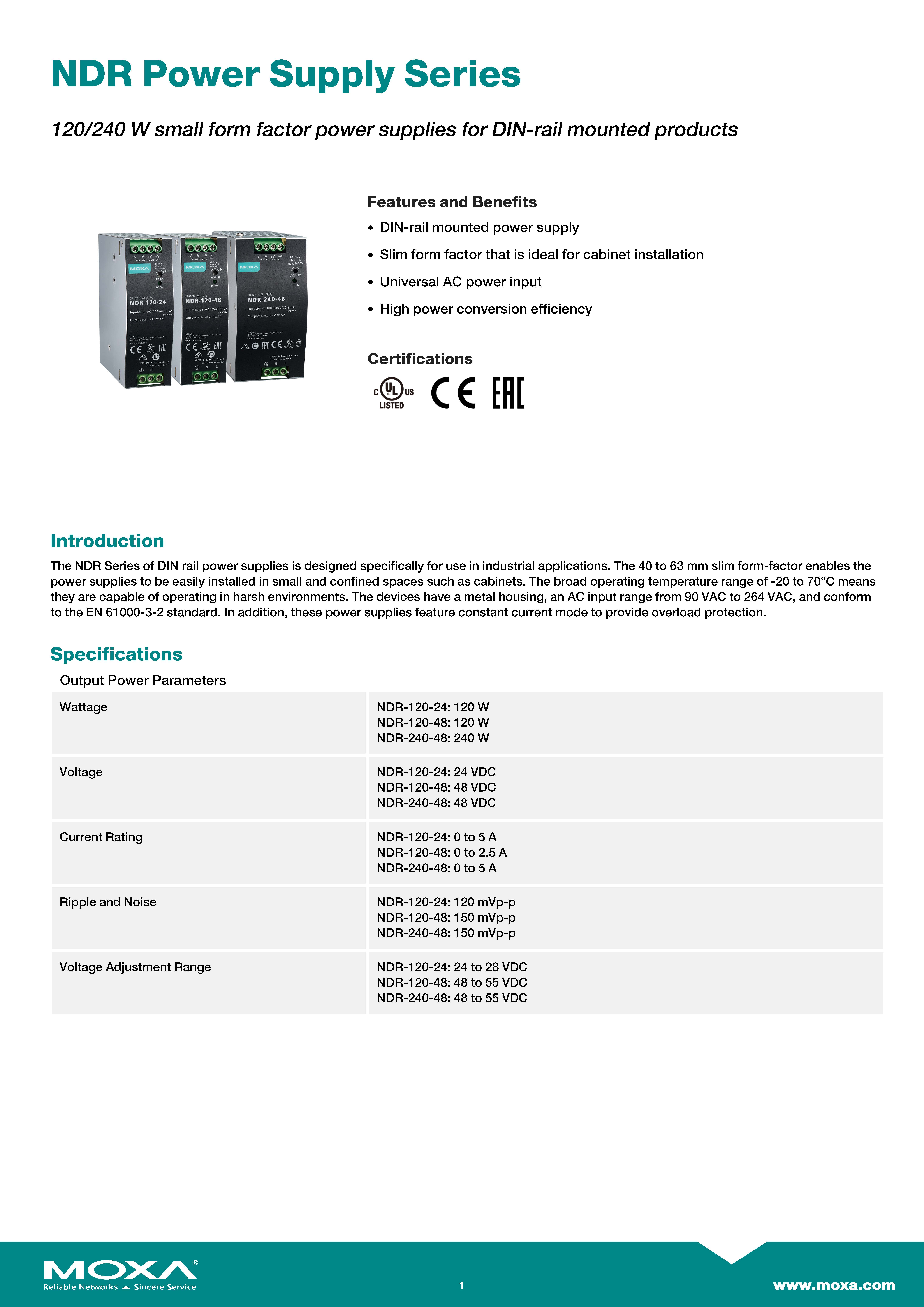 สินค้ายี่ห้อ MOXA รุ่น NDR-120-24 รายละเอียดสินค้า แหล่งจ่ายไฟสวิตชิ่งเกรดอุตสาหกรรม (Industrial DIN Rail Power Supply) ขนาด 120W 24VDC ดีไซน์บางพิเศษเพียง 40 มม. ช่วยประหยัดพื้นที่ในตู้คอนโทรลได้สูงสุด พร้อมประสิทธิภาพการแปลงไฟที่ยอดเยี่ยมและระบบป้องกันไฟฟ้าลัดวงจรที่เชื่อถือได้ ✅ ขอราคาพิเศษสำหรับงานโครงการติดต่อ Mobile : 063-879-9917 Line ID @aimonline