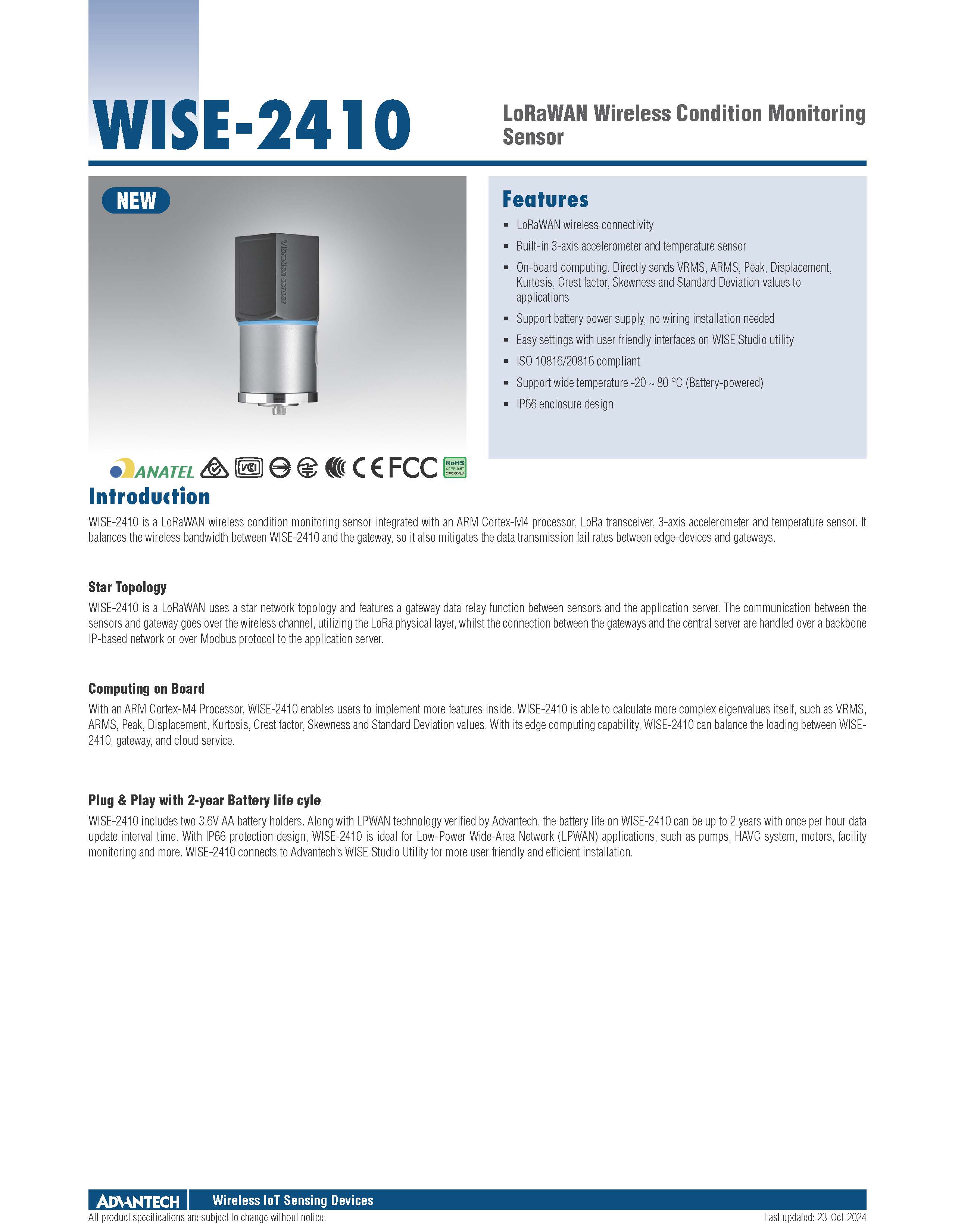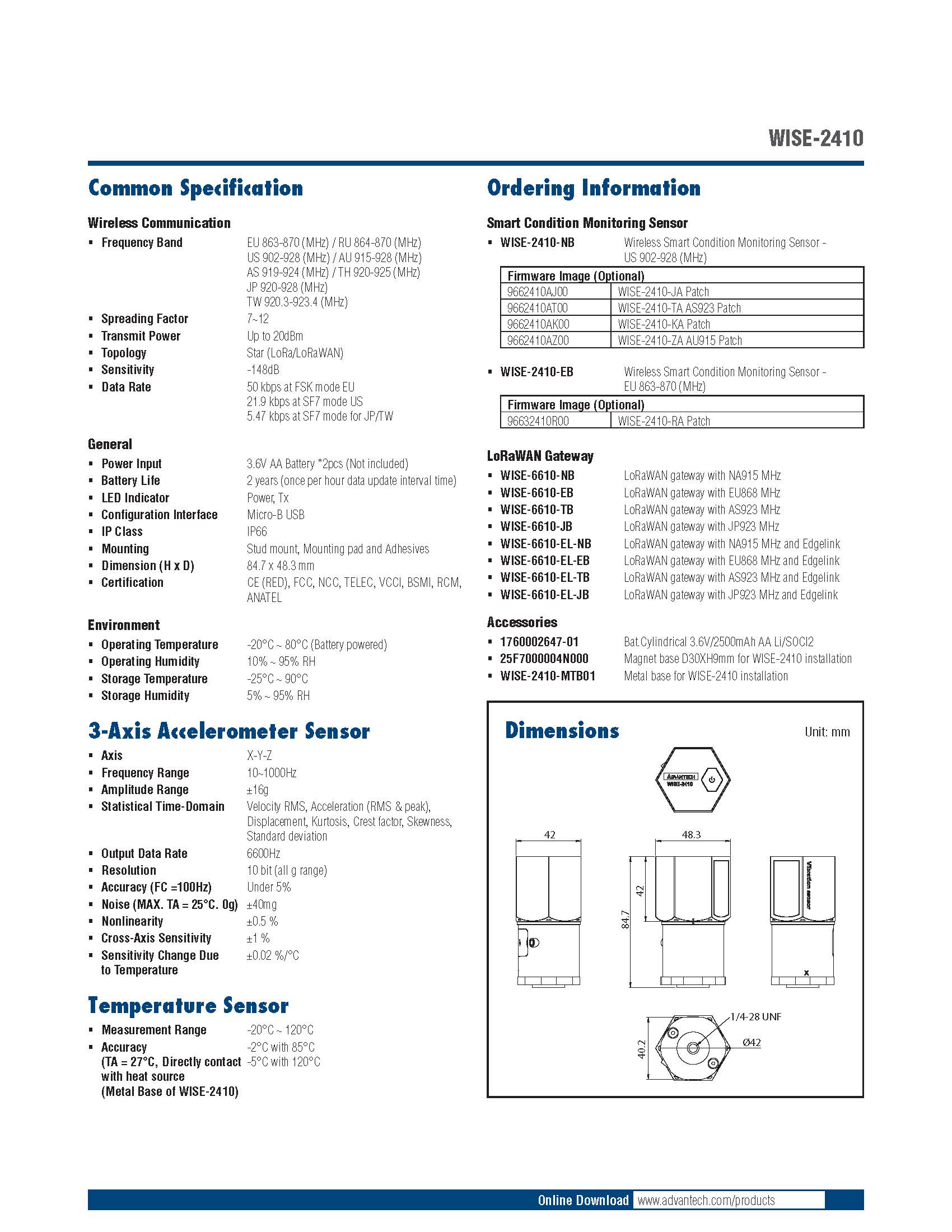 สินค้ายี่ห้อ ADVANTECH รุ่น WISE-2410 รายละเอียดสินค้า เซนเซอร์ตรวจวัดความสั่นสะเทือนและอุณหภูมิไร้สาย (LoRaWAN Smart Vibration Sensor) มาตรฐาน ISO 10816-3 ที่ช่วยวิเคราะห์สุขภาพเครื่องจักร (Predictive Maintenance) ได้อย่างแม่นยำ ทนทานด้วยระดับการป้องกัน IP66 และแบตเตอรี่ในตัว เพื่อการติดตั้งที่ง่ายและตรวจสอบมอเตอร์ในโรงงานอัจฉริยะได้ตลอด 24 ชั่วโมง ✅ ขอราคาพิเศษสำหรับงานโครงการติดต่อ Mobile : 063-879-9917 Line ID @aimonline