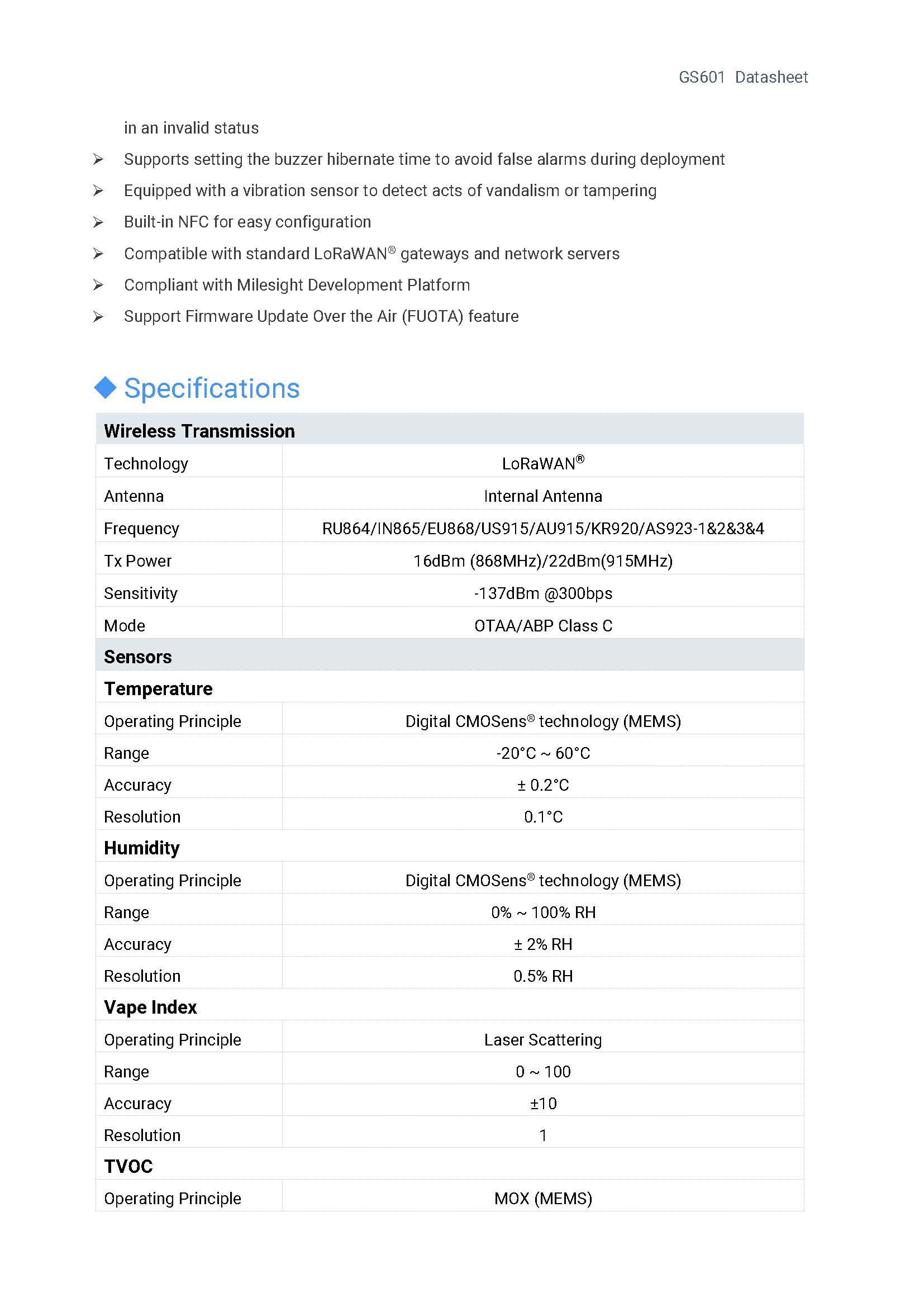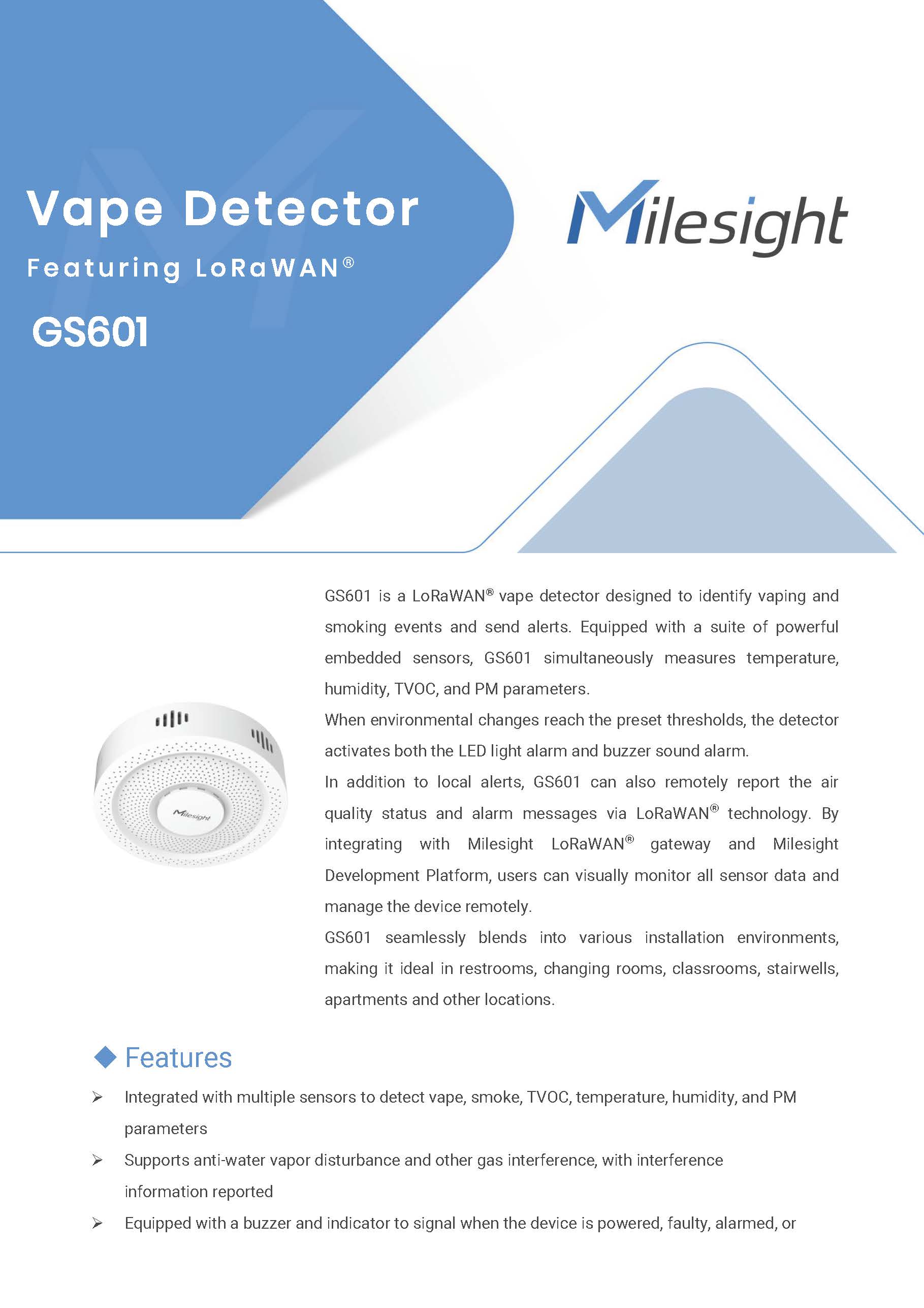 สินค้ายี่ห้อ Milesight รุ่น GS601รายละเอียดสินค้า เครื่องตรวจจับควันบุหรี่และบุหรี่ไฟฟ้า (Smart Vape Detector) อัจฉริยะแบบ 4-in-1 ที่ผสานเซนเซอร์วัดคุณภาพอากาศ (PM2.5, TVOC), อุณหภูมิ และความชื้นไว้ในตัวเดียว สามารถตรวจจับและแจ้งเตือนพฤติกรรมการสูบได้ทันทีด้วยเสียงและไฟ LED พร้อมส่งข้อมูลผ่าน LoRaWAN เพื่อเฝ้าระวังพื้นที่ห้ามสูบในโรงเรียนและอาคารสาธารณะได้อย่างมีประสิทธิภาพ ✅ ขอราคาพิเศษสำหรับงานโครงการติดต่อ Mobile : 063-879-9917Line ID : @aimonline