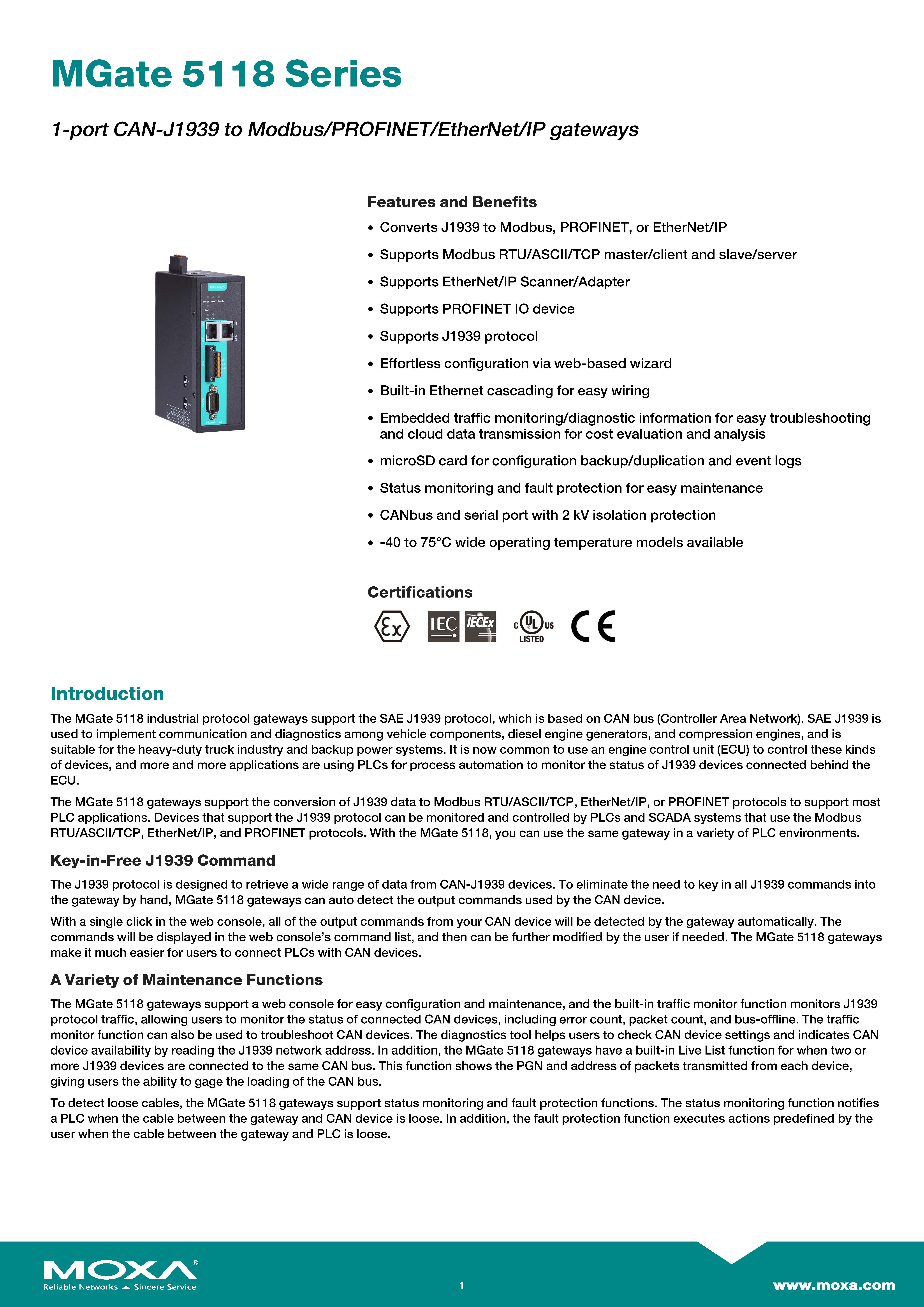 สินค้ายี่ห้อ MOXA รุ่น MGate 5118 รายละเอียดสินค้า เกตเวย์สื่อสารอุตสาหกรรม (Industrial Protocol Gateway) ที่เชื่อมต่อเครือข่าย CAN Bus (SAE J1939) เข้ากับระบบควบคุม Ethernet หลัก (Modbus TCP/PROFINET/EtherNet/IP) ได้อย่างราบรื่น ช่วยให้ PLC หรือ SCADA สามารถตรวจสอบข้อมูลจากเครื่องปั่นไฟและยานพาหนะหนักได้โดยตรง พร้อมเครื่องมือวิเคราะห์ทราฟฟิกในตัวและทนทานต่อสภาพแวดล้อมสุดขั้ว ✅ ขอราคาพิเศษสำหรับงานโครงการติดต่อ Mobile : 063-879-9917 Line ID @aimonline