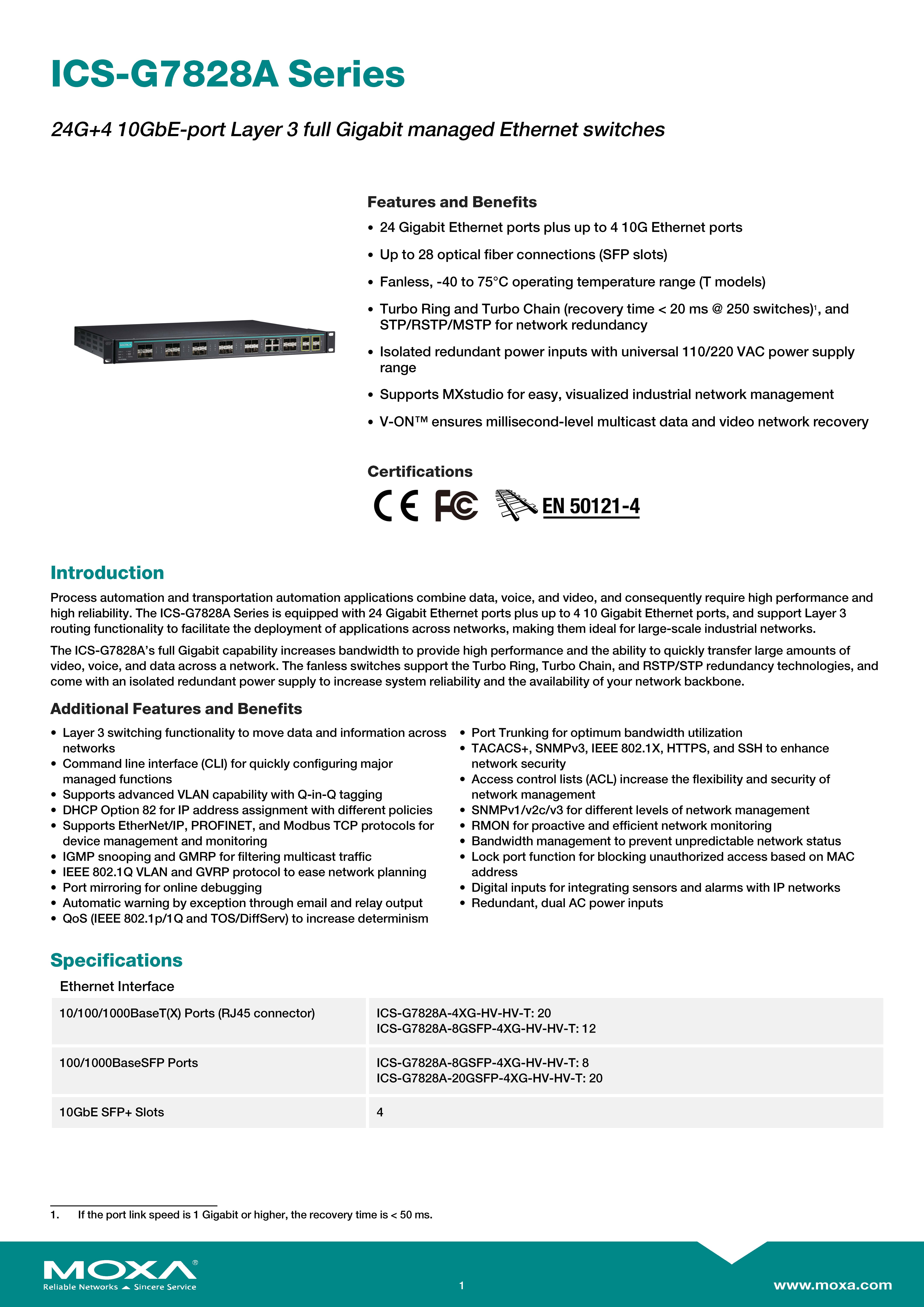 สินค้ายี่ห้อ MOXA รุ่น ICS-G7828A-4XG-HV-HV-T รายละเอียดสินค้า Industrial Layer 3 Core Switch ประสิทธิภาพสูงที่รองรับการส่งข้อมูลปริมาณมหาศาลด้วยพอร์ต 10GbE SFP+ จำนวน 4 ช่องและ Gigabit Ethernet 24 ช่อง มาพร้อมระบบจ่ายไฟสำรองแบบ High Voltage คู่ (Dual HV) และดีไซน์ทนทานต่ออุณหภูมิสุดขั้ว (-40 ถึง 75°C) เพื่อเป็นกระดูกสันหลังของเครือข่ายในโรงงานและระบบอัตโนมัติที่ต้องการความเสถียรสูงสุด ✅ ขอราคาพิเศษสำหรับงานโครงการติดต่อ Mobile : 063-879-9917 Line ID @aimonline