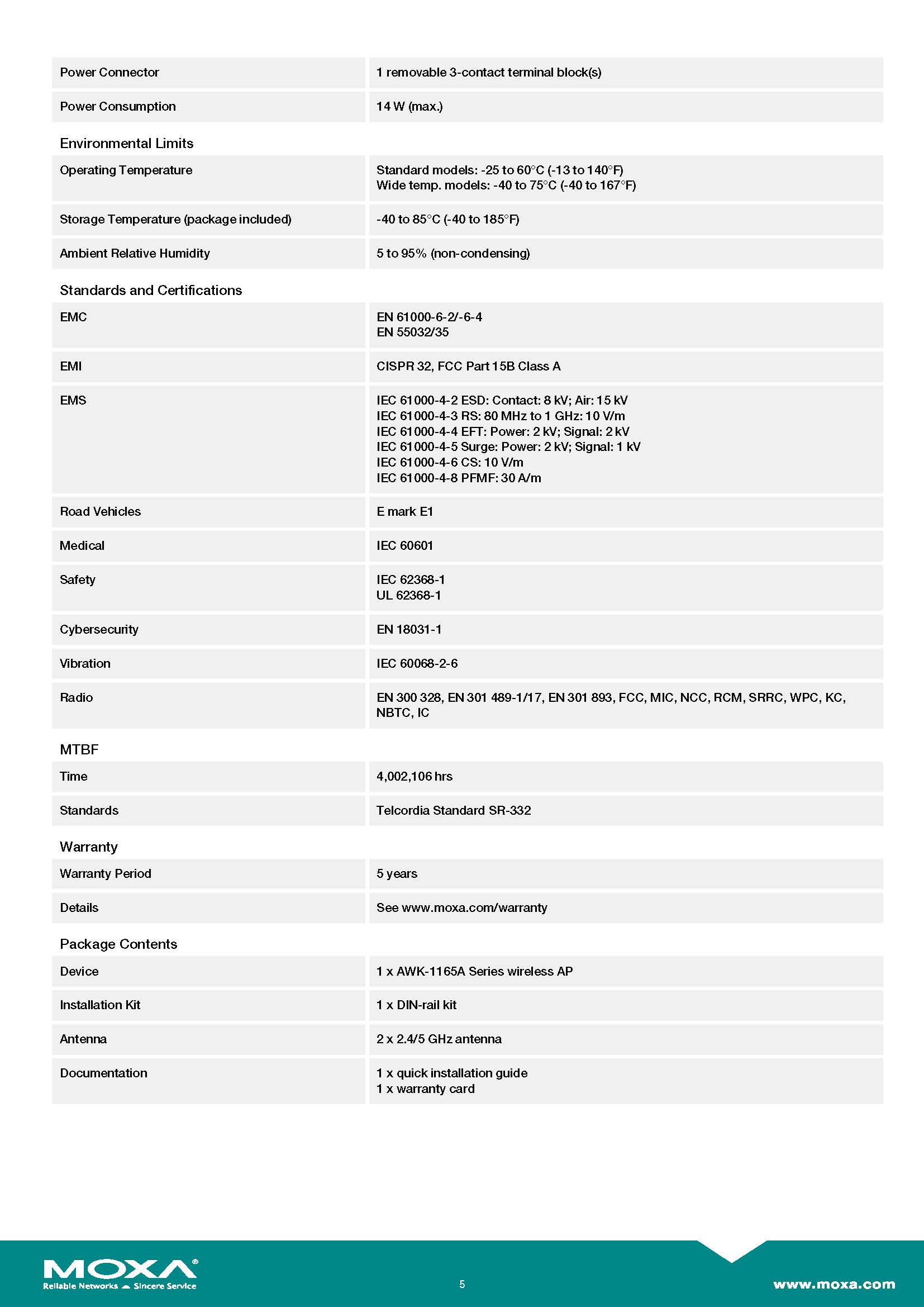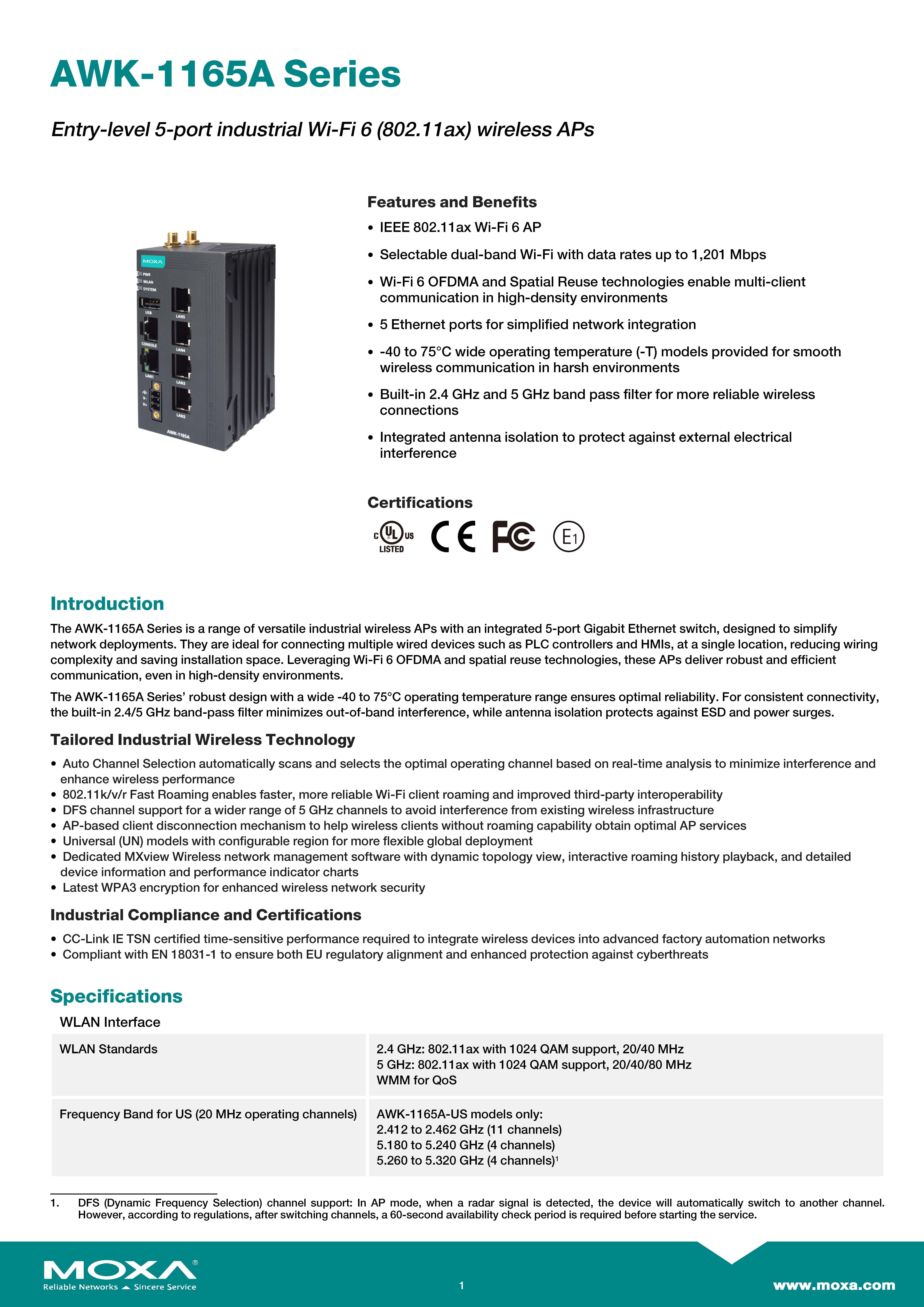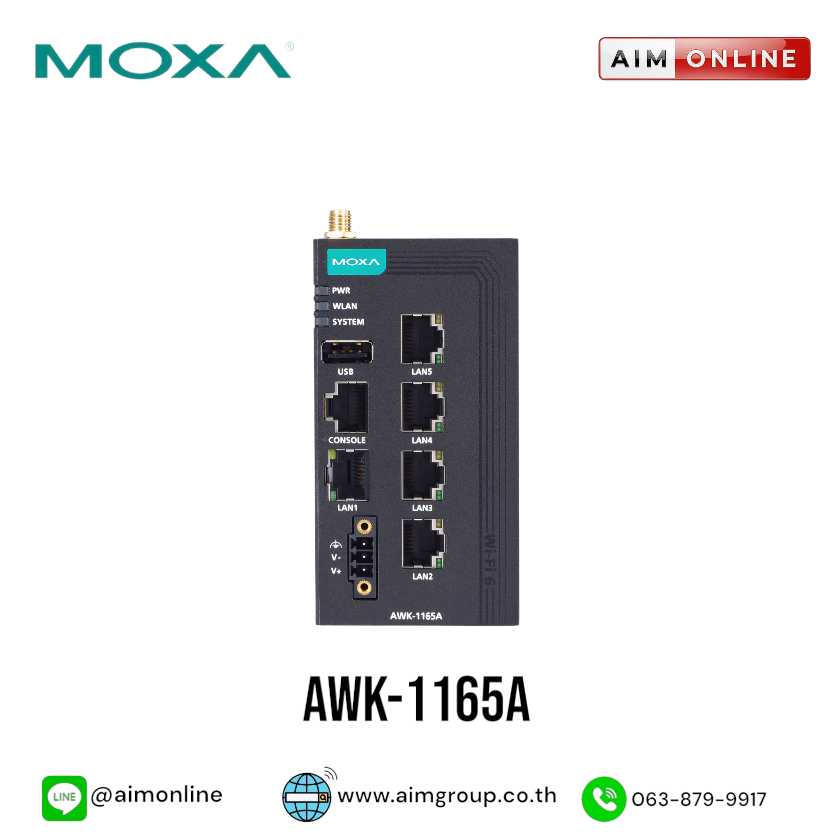 สินค้ายี่ห้อ MOXA รุ่น AWK-1165A รายละเอียดสินค้า อุปกรณ์กระจายสัญญาณไร้สายเกรดอุตสาหกรรม (Industrial Wireless AP/Bridge/Client) ขนาดกะทัดรัดที่รองรับมาตรฐาน IEEE 802.11ac (Wi-Fi 5) เพื่อการรับส่งข้อมูลความเร็วสูง พร้อมเทคโนโลยี Turbo Roaming ที่ช่วยให้อุปกรณ์เคลื่อนที่อย่าง AGV เชื่อมต่อได้ต่อเนื่องไม่มีสะดุด และติดตั้งง่ายด้วยดีไซน์ DIN-Rail ที่ทนทาน ✅ ขอราคาพิเศษสำหรับงานโครงการติดต่อ Mobile : 063-879-9917 Line ID @aimonline