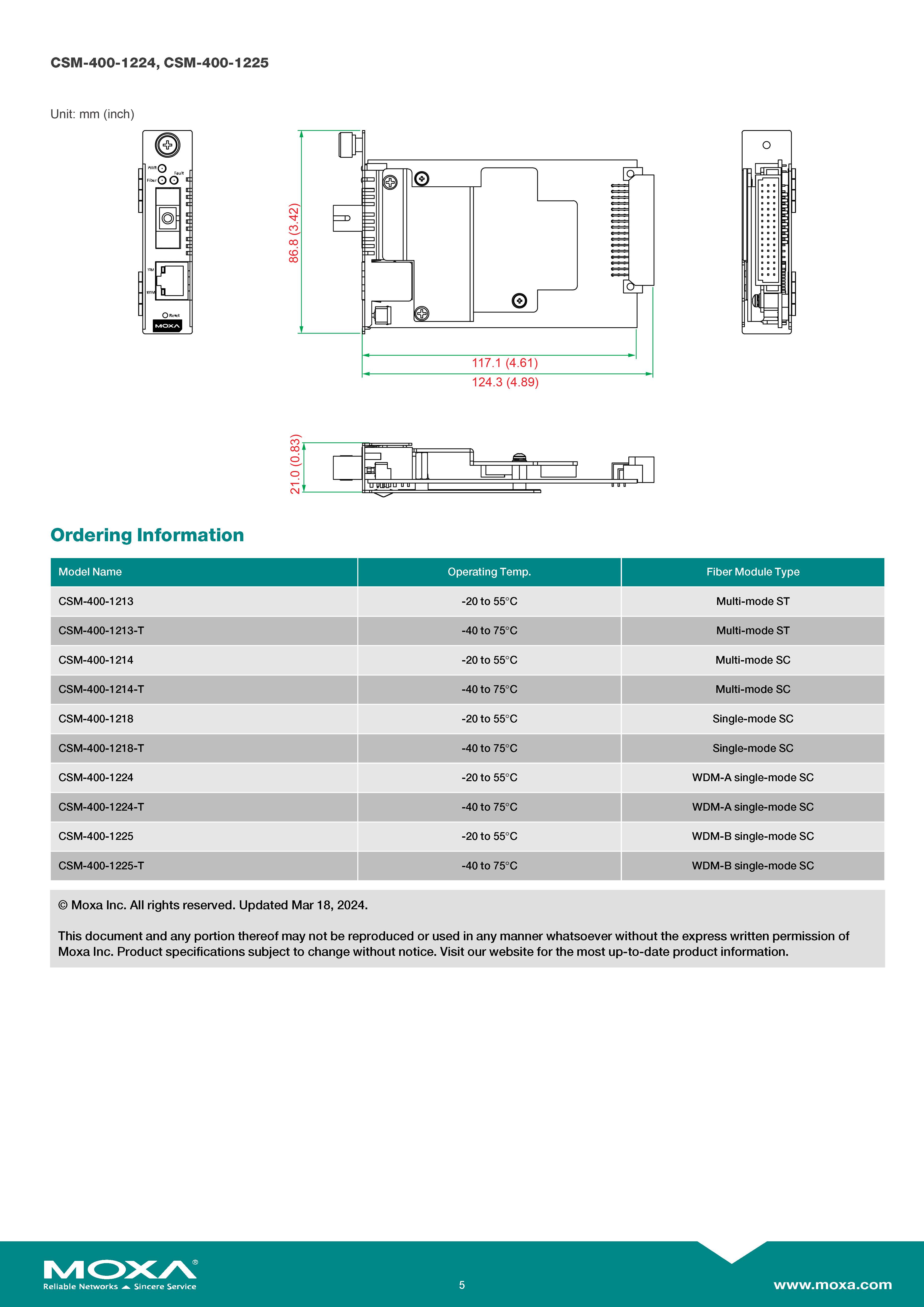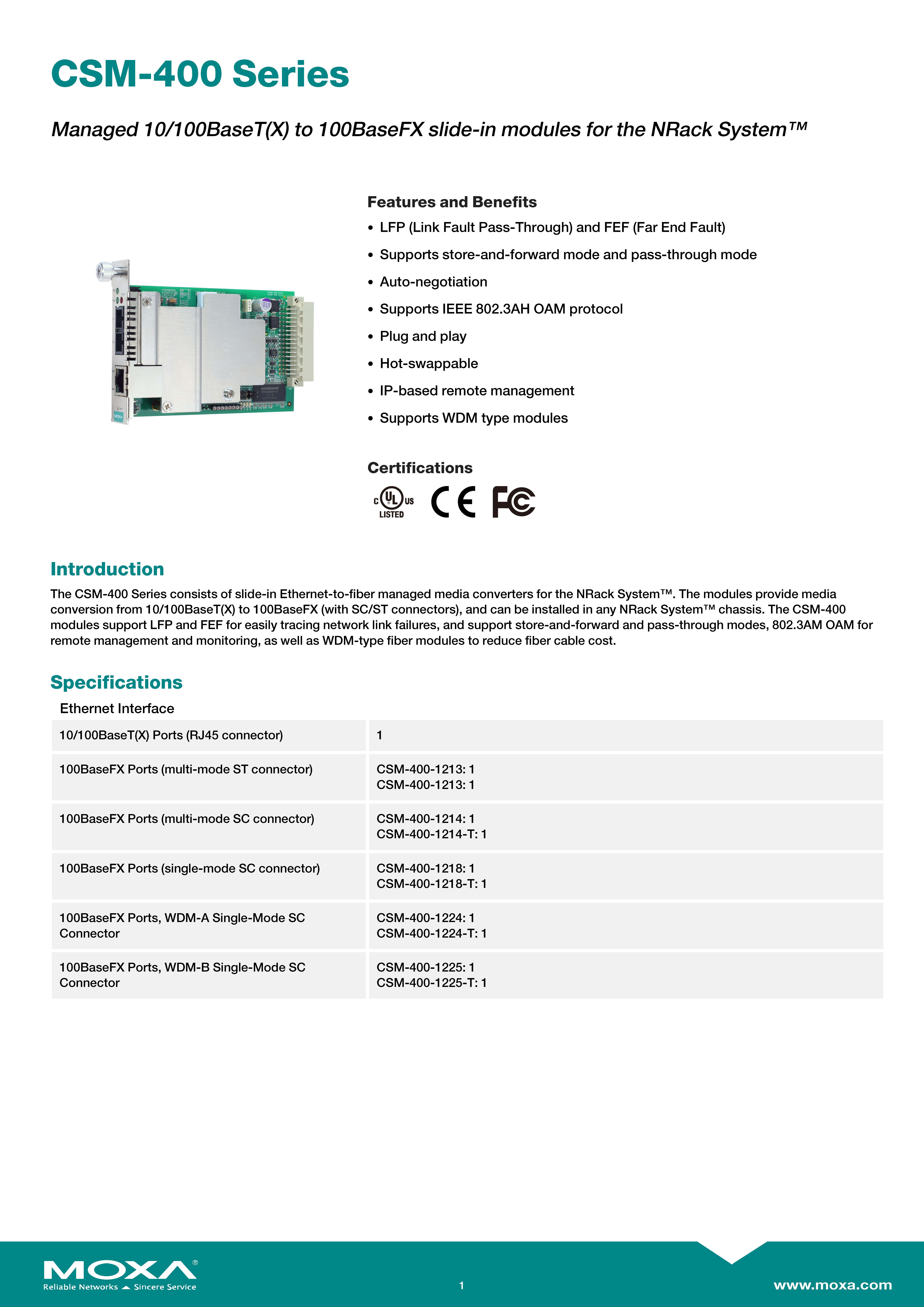สินค้ายี่ห้อ MOXA รุ่น CSM-400-1214 รายละเอียดสินค้า โมดูลแปลงสัญญาณอีเธอร์เน็ตเป็นไฟเบอร์ออปติก (10/100BaseT(X) to 100BaseFX Slide-in Media Converter Module) จาก MOXA แบบ Multi-mode ชนิดหัวต่อ ST ออกแบบมาเพื่อติดตั้งในแร็คแชสซีรวมศูนย์ (NRack System) ✅ ขอราคาพิเศษสำหรับงานโครงการติดต่อ Mobile : 063-879-9917 Line ID @aimonline *ราคาสินค้าอาจจะมีการเปลี่ยนแปลงโดยไม่แจ้งให้ทราบล่วงหน้า รบกวนติดต่อฝ่ายขายเพื่ออัพเดทราคา