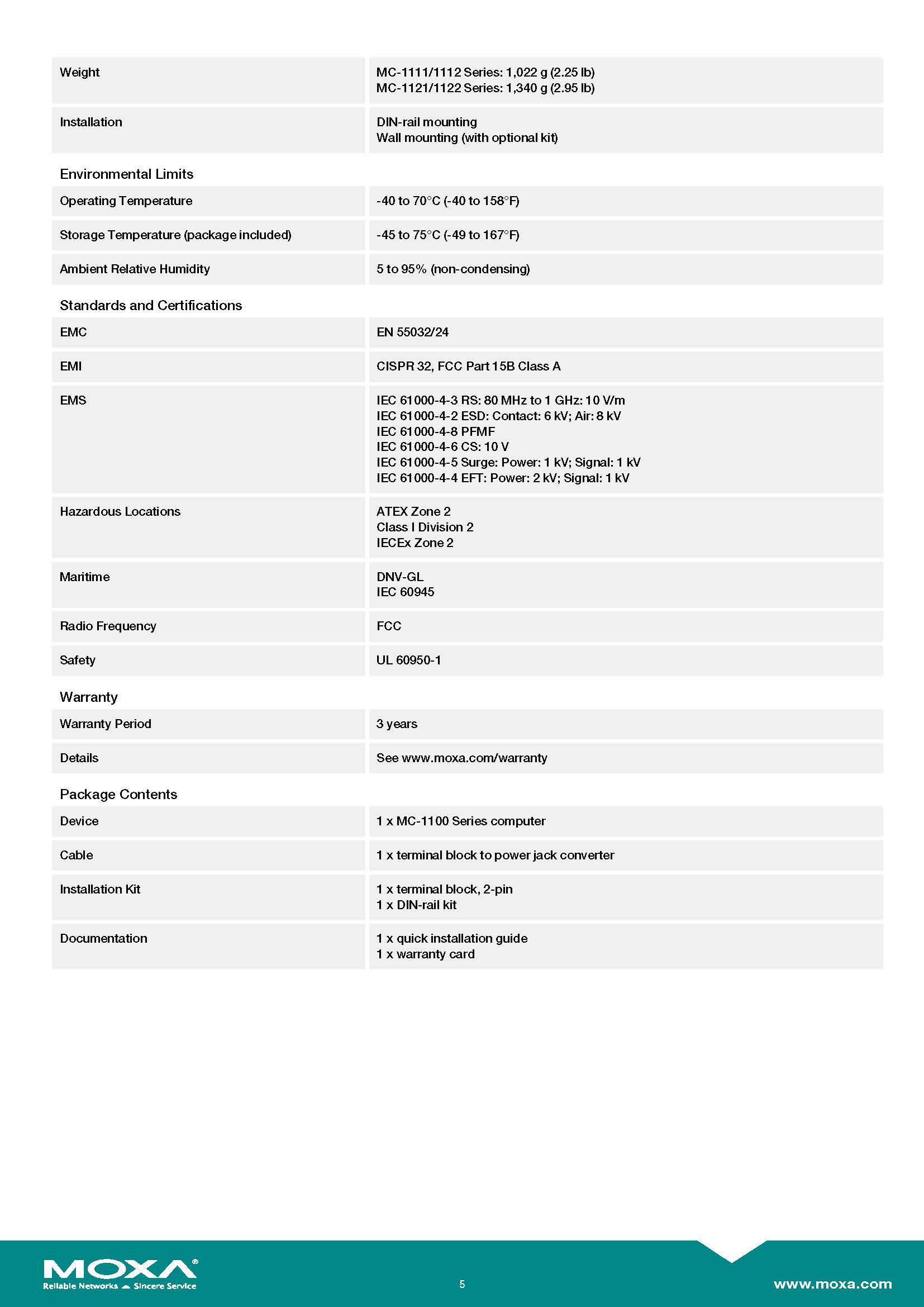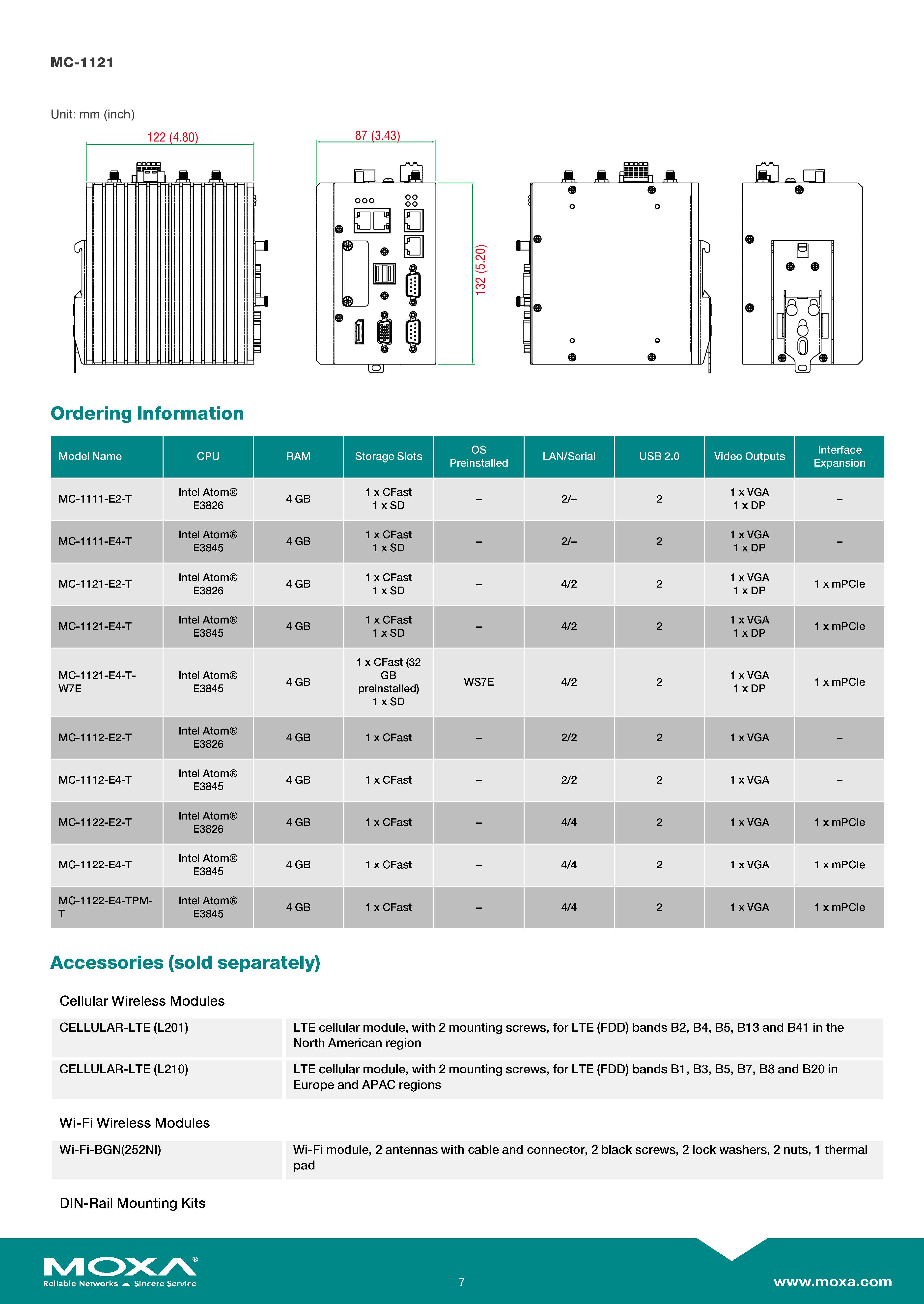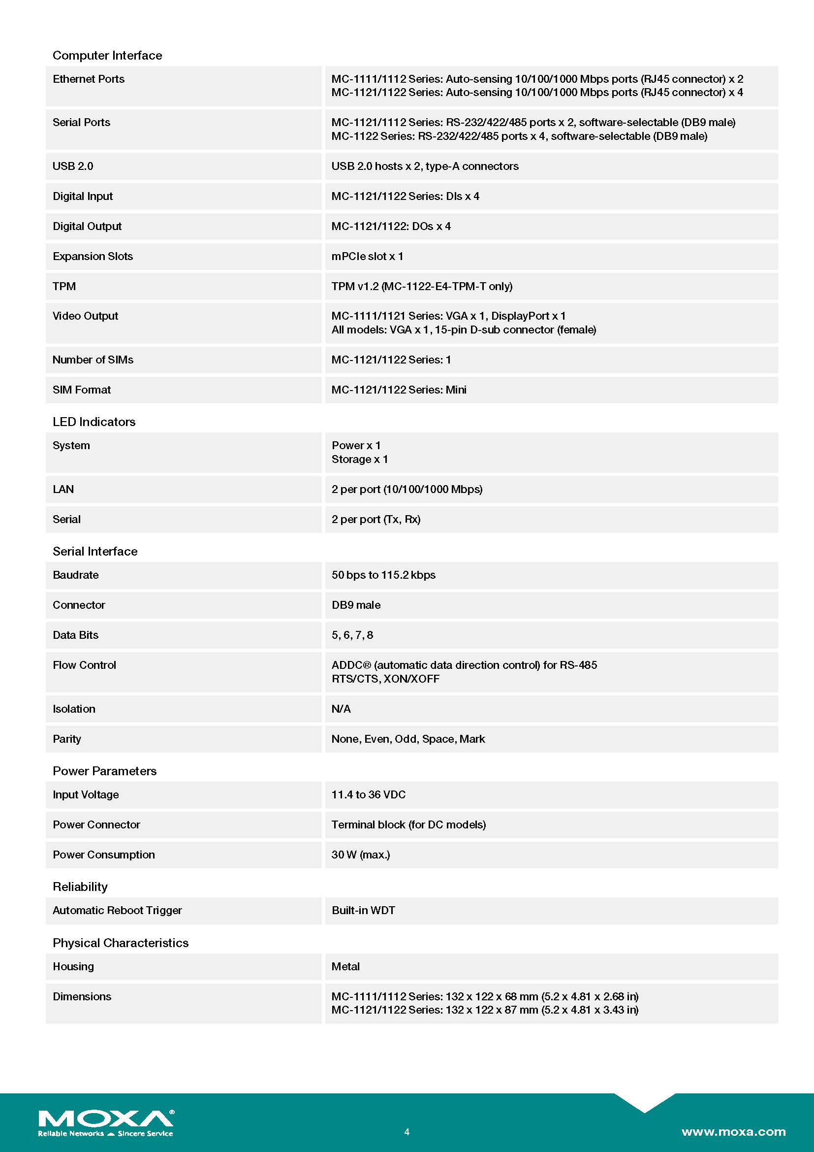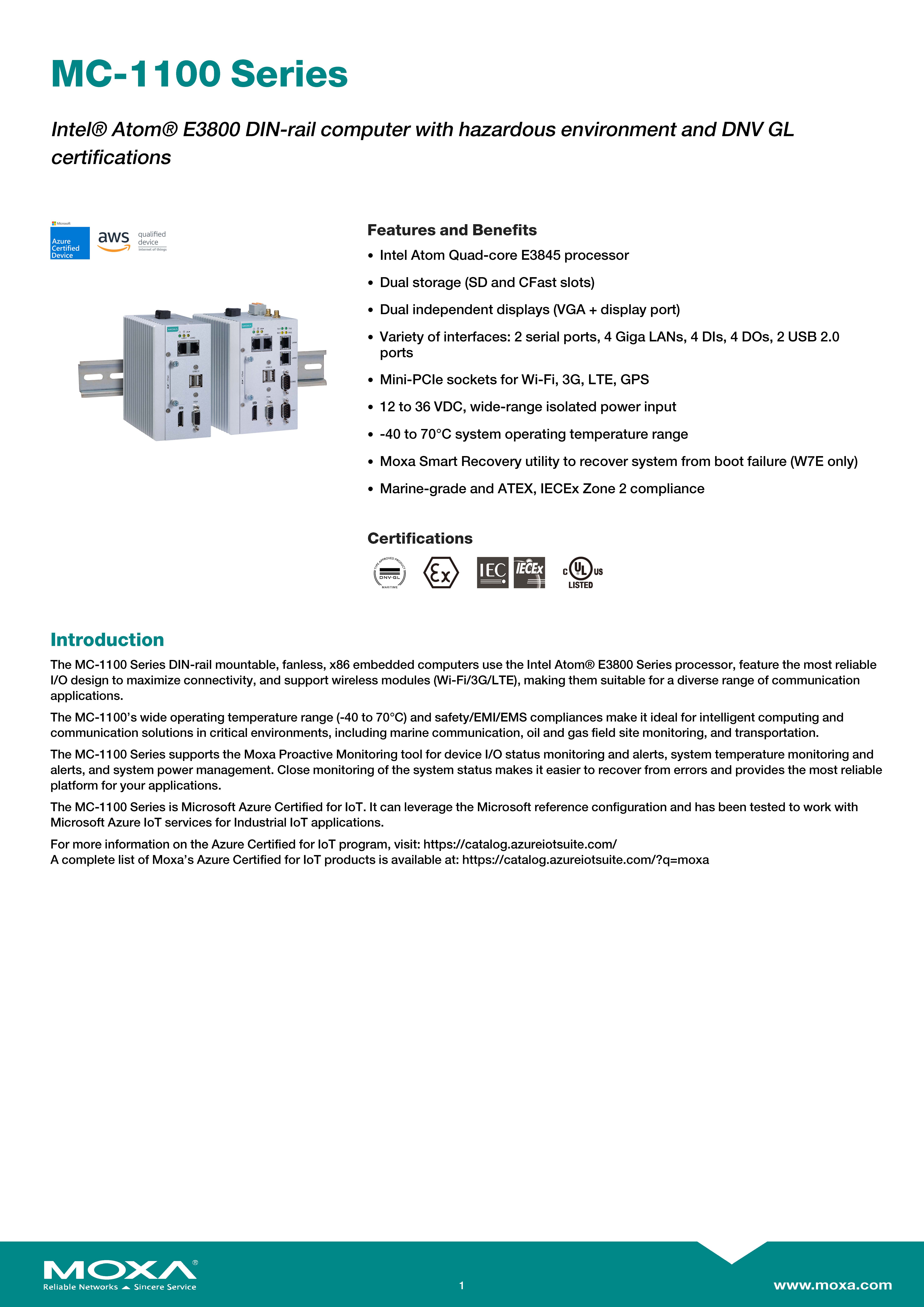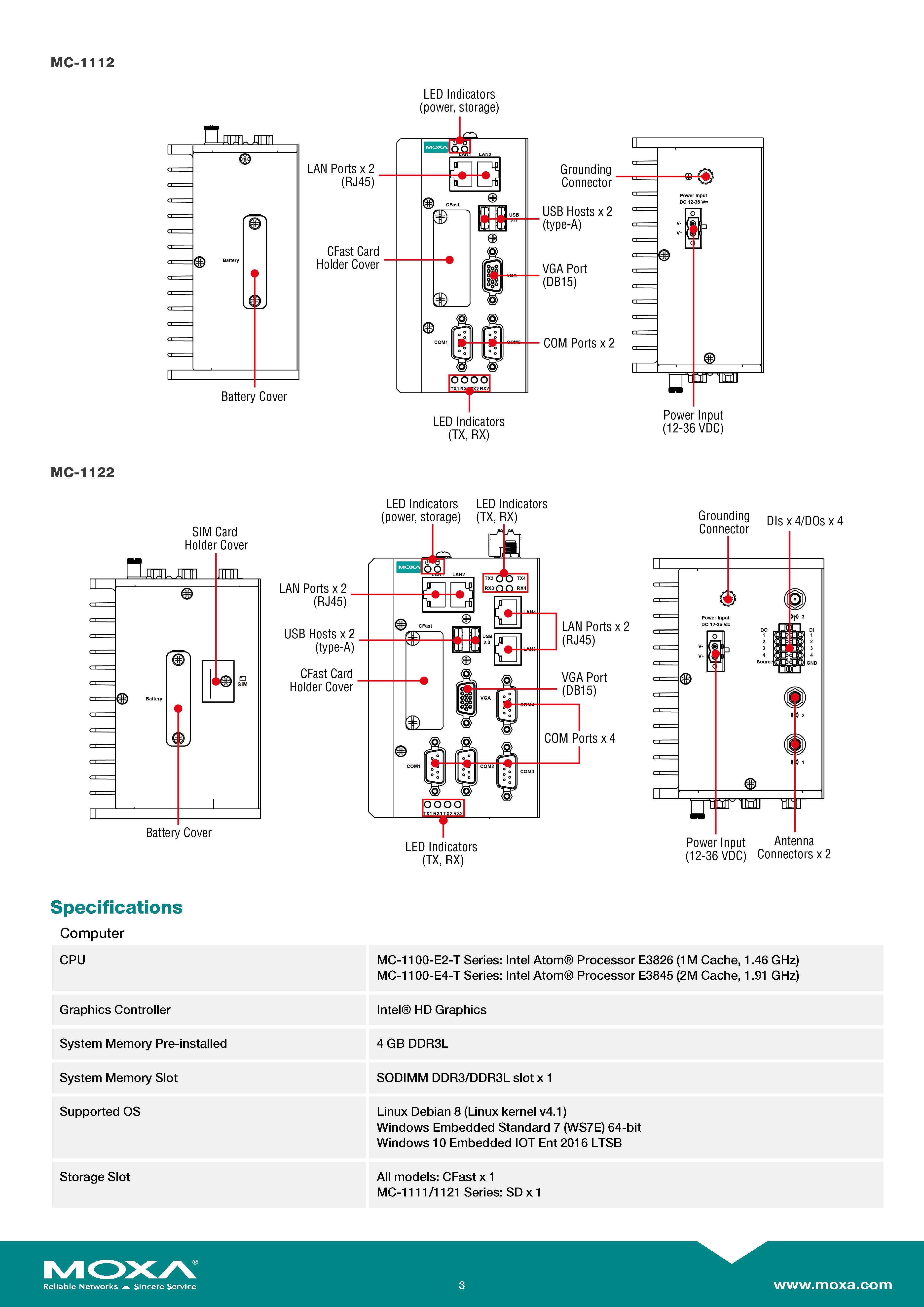 MOXA x86 embedded computer รุ่น : MC-1111-E2-T Intel Atom® dual-core E3826 processor, 4 GB RAM, 1 VGA port, 2 USB ports, 2 Gigabit Ethernet ports, 1 CFast socket, 1 SD slot, 1 DisplayPort, 12 to 36 VDC power, -40 to 70°C operating temperature ขอราคาพิเศษสำหรับงานโครงการติดต่อฝ่ายขาย Line ID : @aimonline ฝ่ายขายโทร: 063-879-9917 ( สินค้ายังไม่รวมภาษีมูลค่าเพิ่ม, ค่าขนส่ง , สินค้าสั่งต่างประเทศราคาอาจมีการเปลี่ยนแปลงตามอัตราแลกเปลี่ยน โดยไม่แจ้งให้ทราบล่วงหน้า) เช็คสต๊อกสินค้าก่อนสั่งซื้อ #W24M92X04D231229RAM
