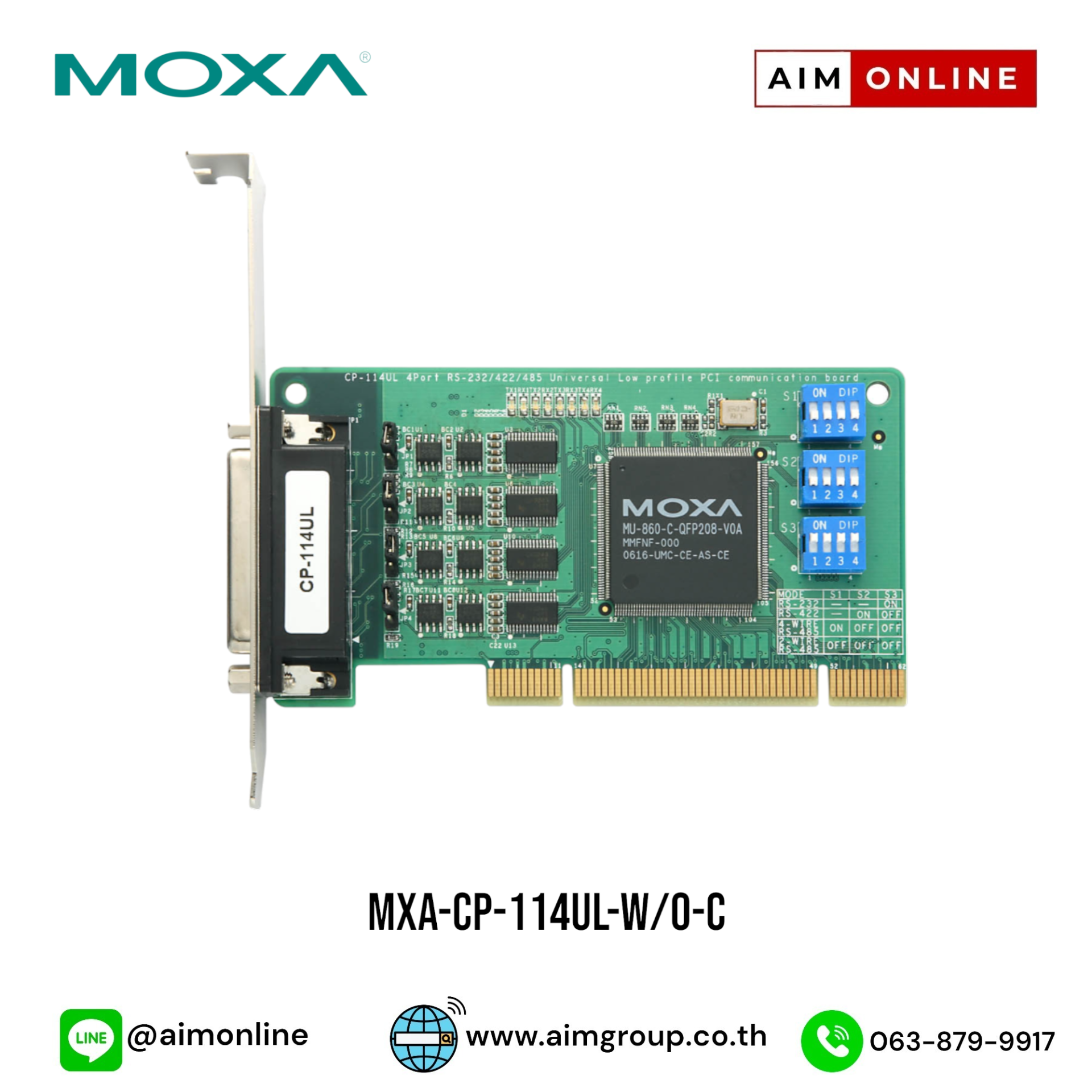 PCI Serial Cards 4-port RS-232/422/485 Universal PCI serial boards with optional 2 kV isolation รุ่น MXA-CP-102U ขอราคาพิเศษสำหรับงานโครงการติดต่อฝ่ายขาย Line ID : @aimonline ฝ่ายขายโทร: 063-879-9917 ( สินค้ายังไม่รวมภาษีมูลค่าเพิ่ม, ค่าขนส่ง , สินค้าสั่งต่างประเทศราคาอาจมีการเปลี่ยนแปลงตามอัตราแลกเปลี่ยน โดยไม่แจ้งให้ทราบล่วงหน้า) เช็คสต๊อกสินค้าก่อนสั่งซื้อ #W00S00I00D231118RAM