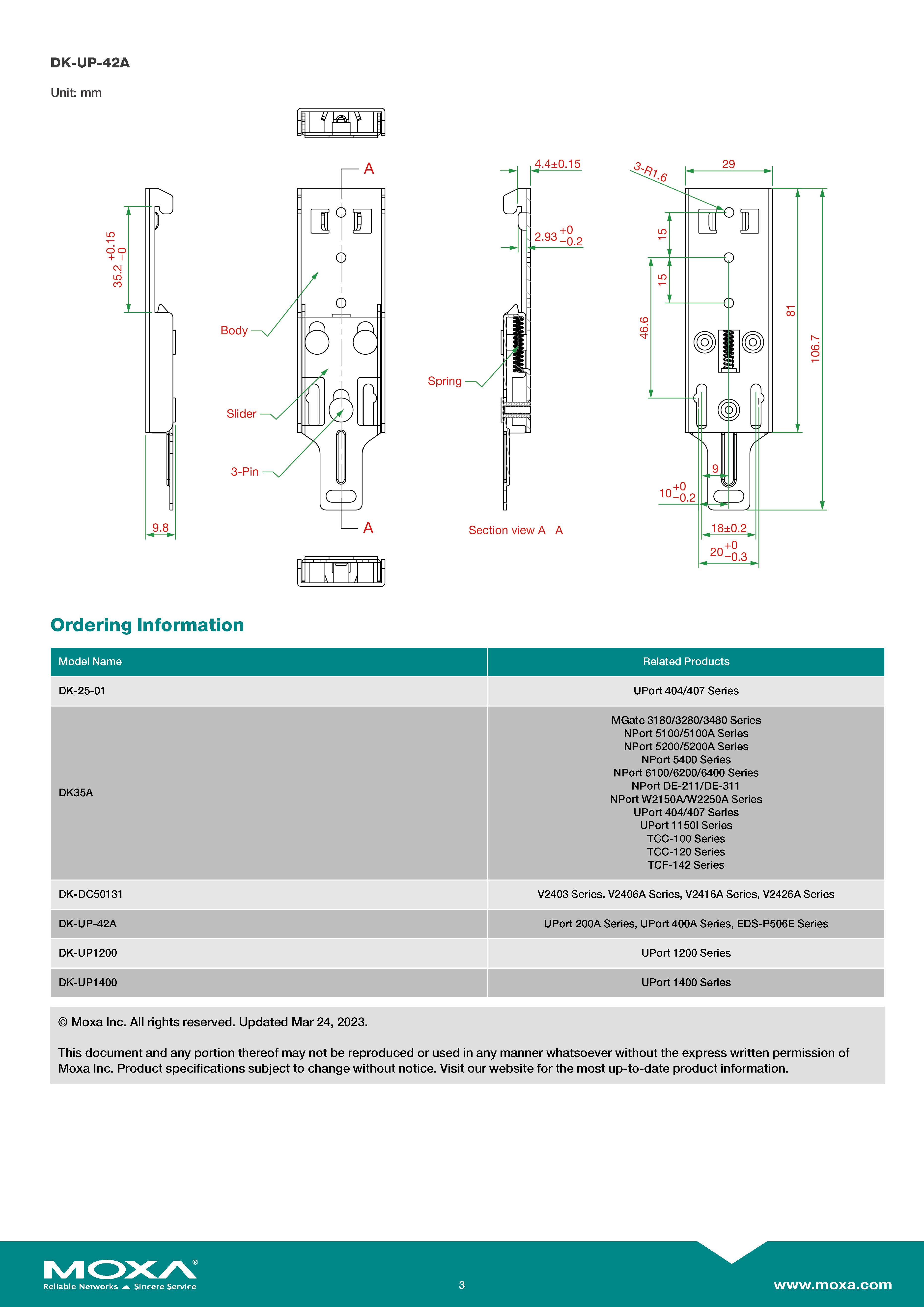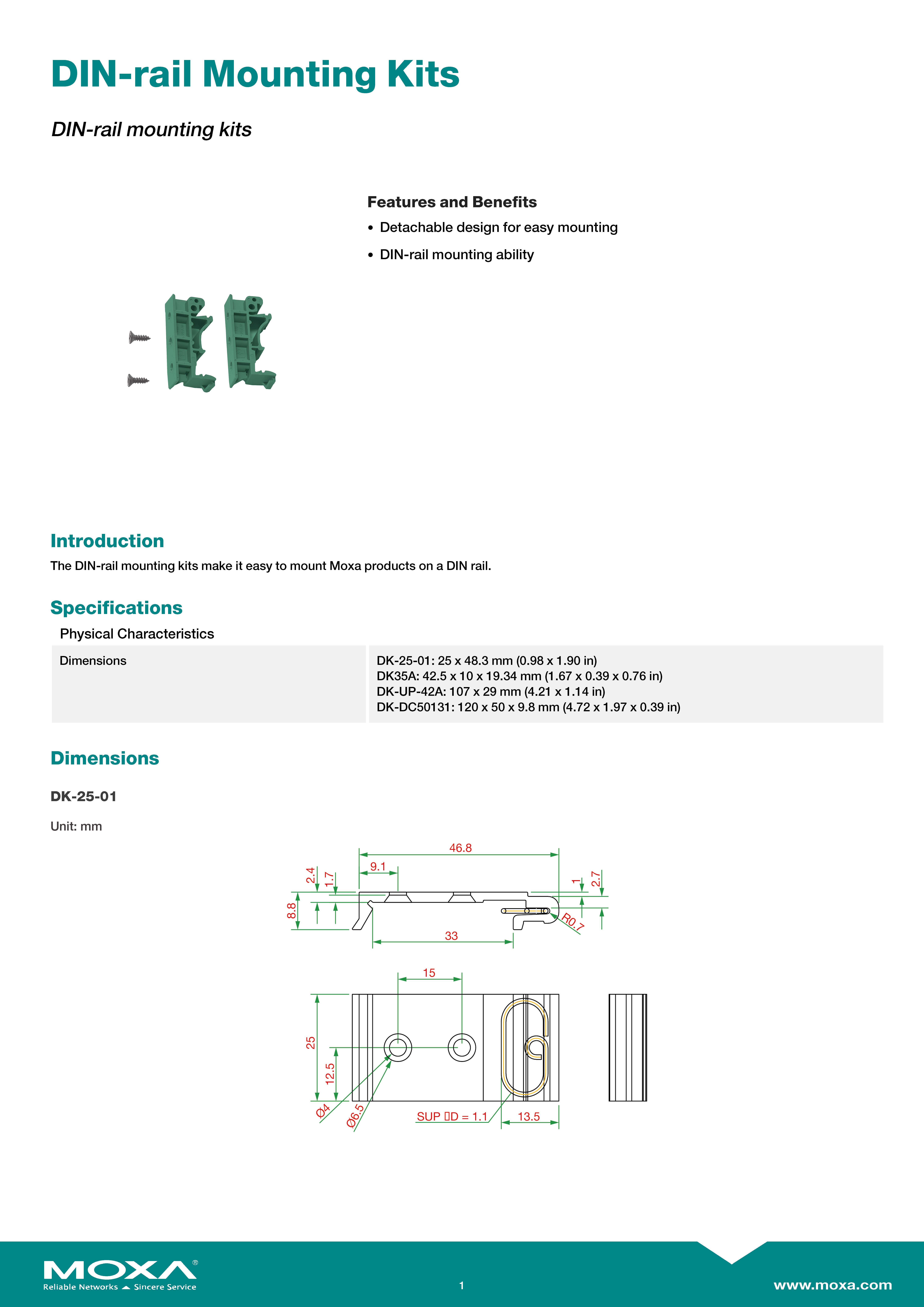 DIN-rail Mounting Kits Moxa's DIN-rail mounting kits have been designed to simplify installation of products in a variety of industrial environments. รุ่น DK35A ขอราคาพิเศษสำหรับงานโครงการติดต่อฝ่ายขาย Line ID : @aimonline ฝ่ายขายโทร: 063-879-9917 ( สินค้ายังไม่รวมภาษีมูลค่าเพิ่ม, ค่าขนส่ง , สินค้าสั่งต่างประเทศราคาอาจมีการเปลี่ยนแปลงตามอัตราแลกเปลี่ยน โดยไม่แจ้งให้ทราบล่วงหน้า) เช็คสต๊อกสินค้าก่อนสั่งซื้อ #W00S00I00D231118RAM
