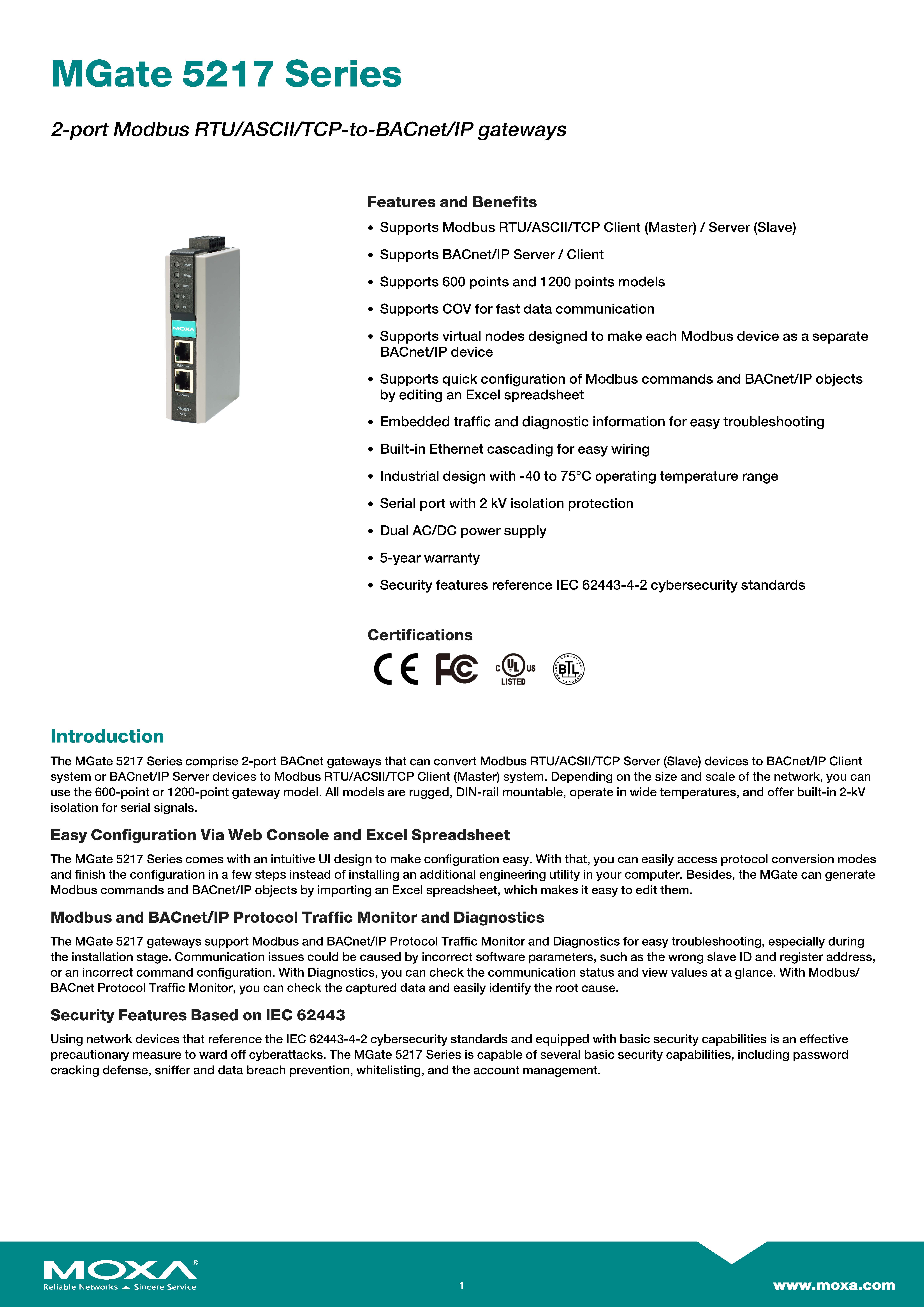 MOXA 2 port Modbus-to-BACnet/IP gateway, 1200 points, 2kV isolation, Model MGate 5217I-1200-T ขอราคาพิเศษสำหรับงานโครงการ ติดต่อฝ่ายขาย Line ID : @aimonline ฝ่ายขายโทร: 063-879-9917 ( สินค้ายังไม่รวมภาษีมูลค่าเพิ่ม, ค่าขนส่ง ) เช็คสต๊อกล่าสุดสินค้าก่อนสั่งซื้อ ราคายังไม่รวมค่าติดตั้ง #NP24
