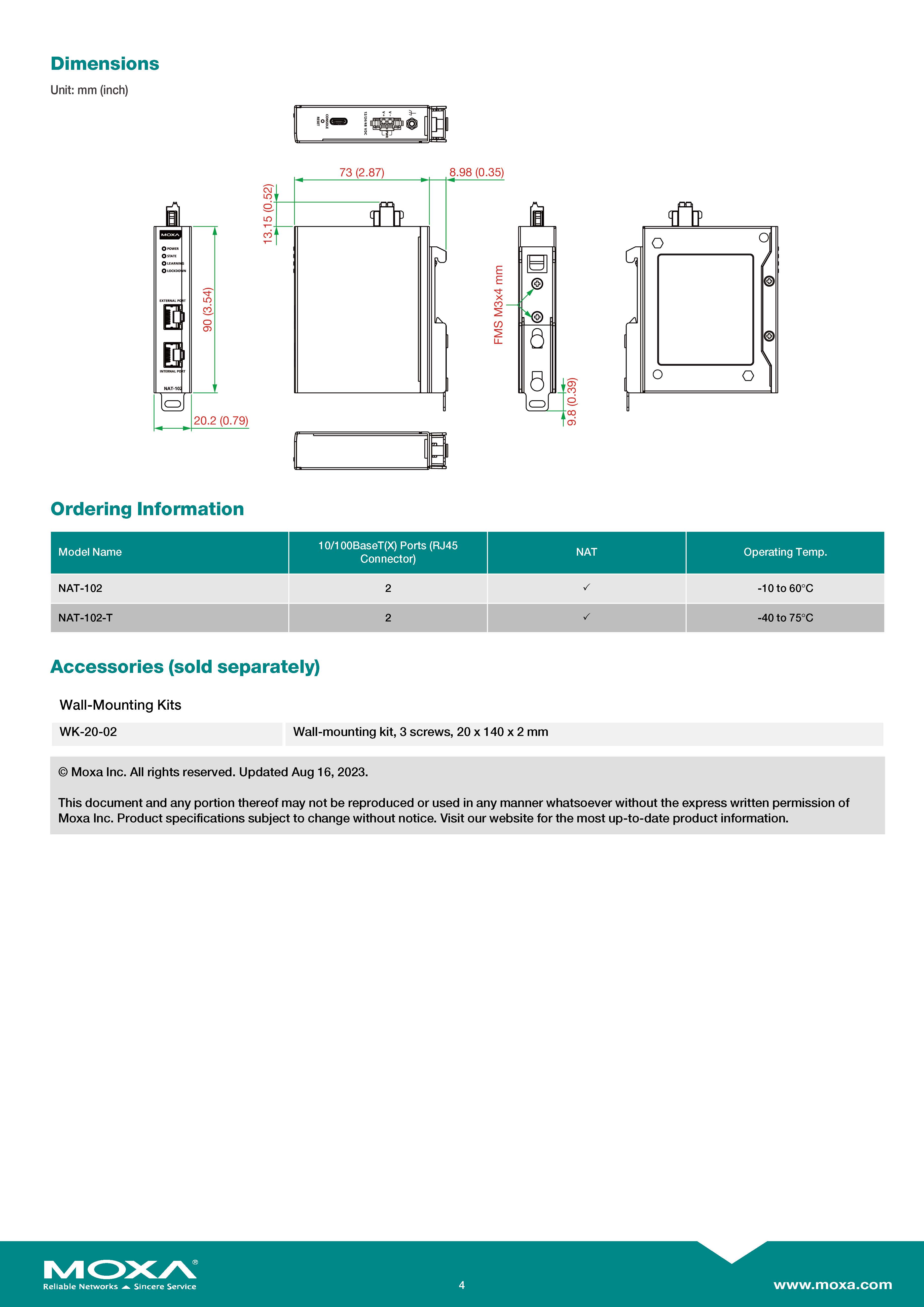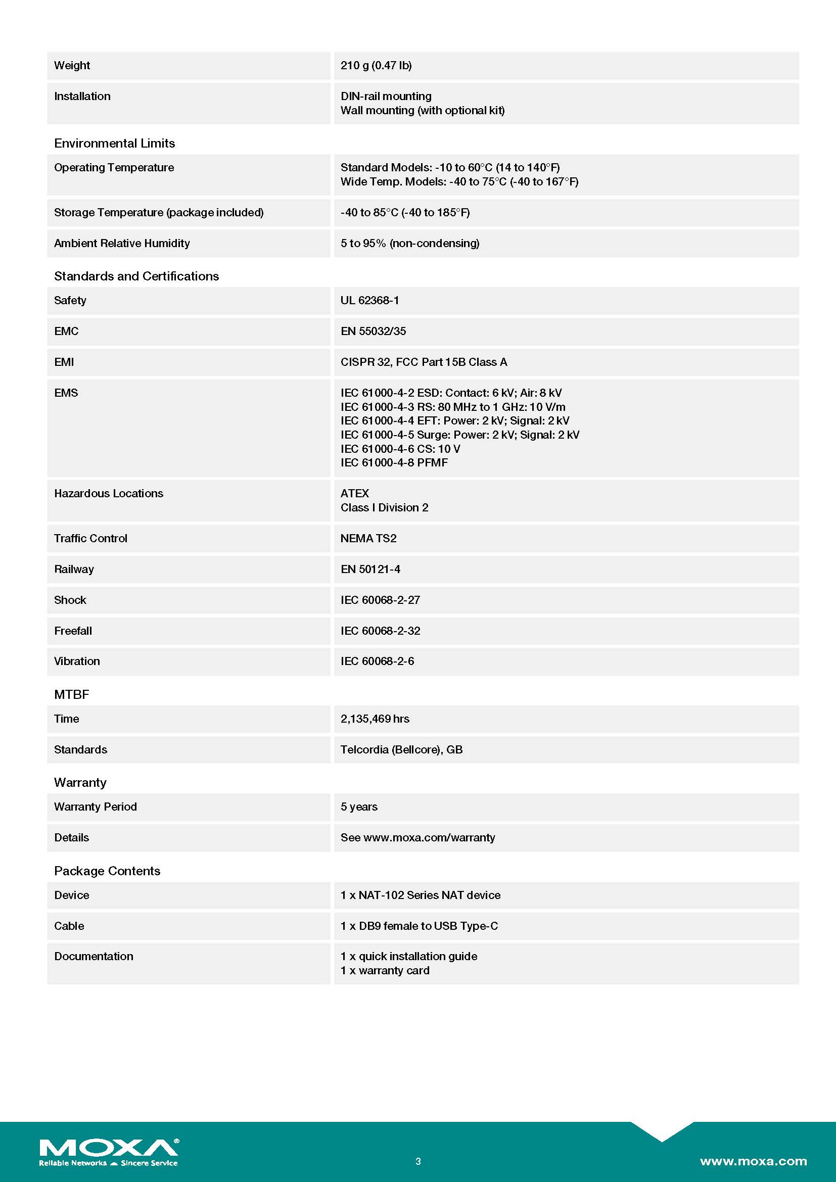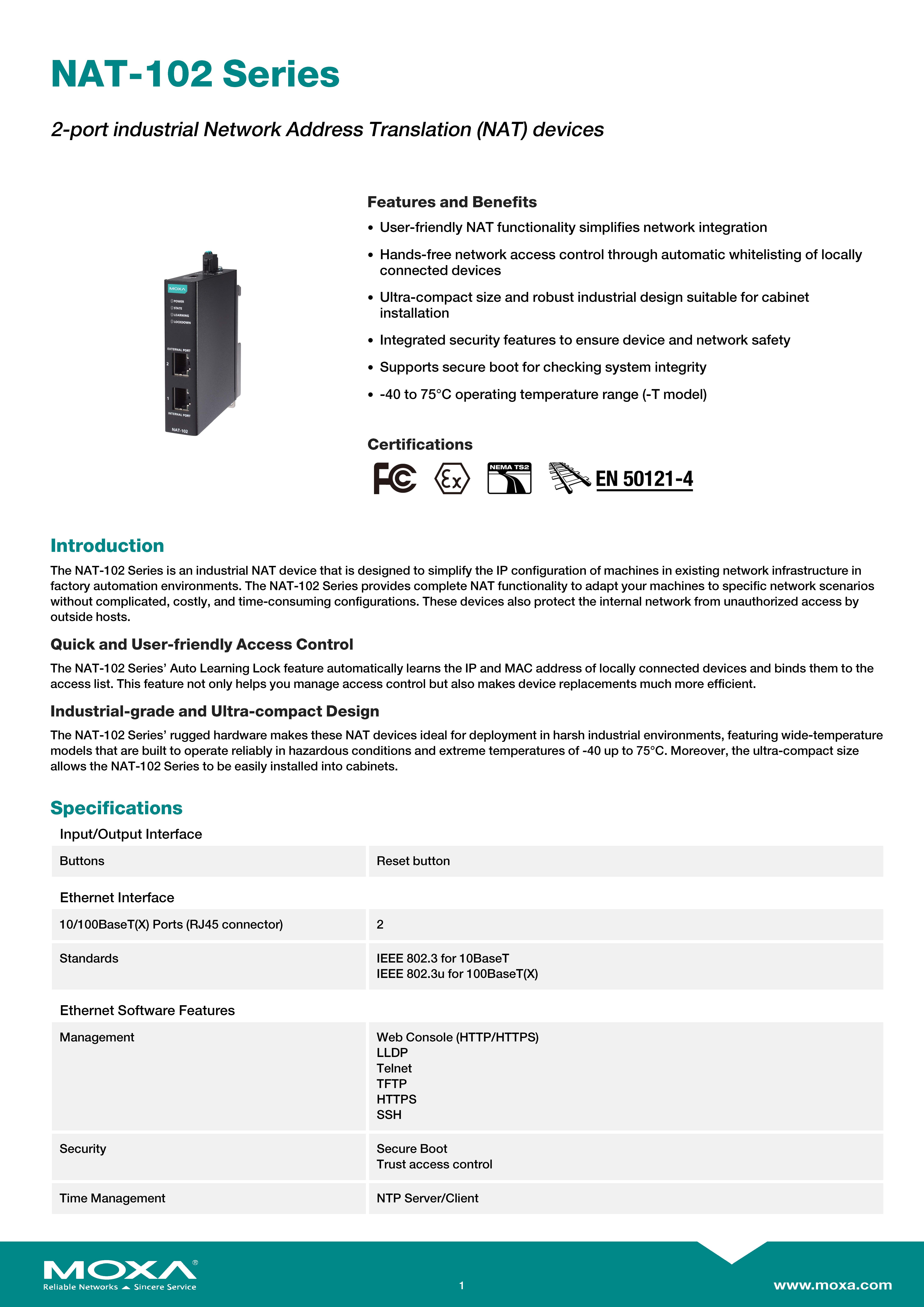 MOXA 2-port industrial Network Address Translation (NAT) devices Model: NAT-102 ขอราคาพิเศษสำหรับงานโครงการ ติดต่อฝ่ายขาย Line ID : @aimonline ฝ่ายขายโทร: 063-879-9917 ( สินค้ายังไม่รวมภาษีมูลค่าเพิ่ม, ค่าขนส่ง ) เช็คสต๊อกล่าสุดสินค้าก่อนสั่งซื้อ ราคายังไม่รวมค่าติดตั้ง