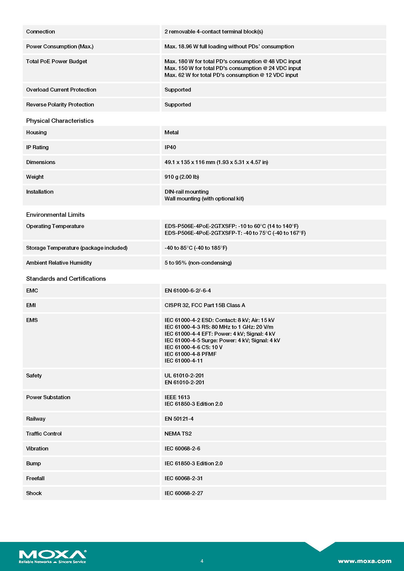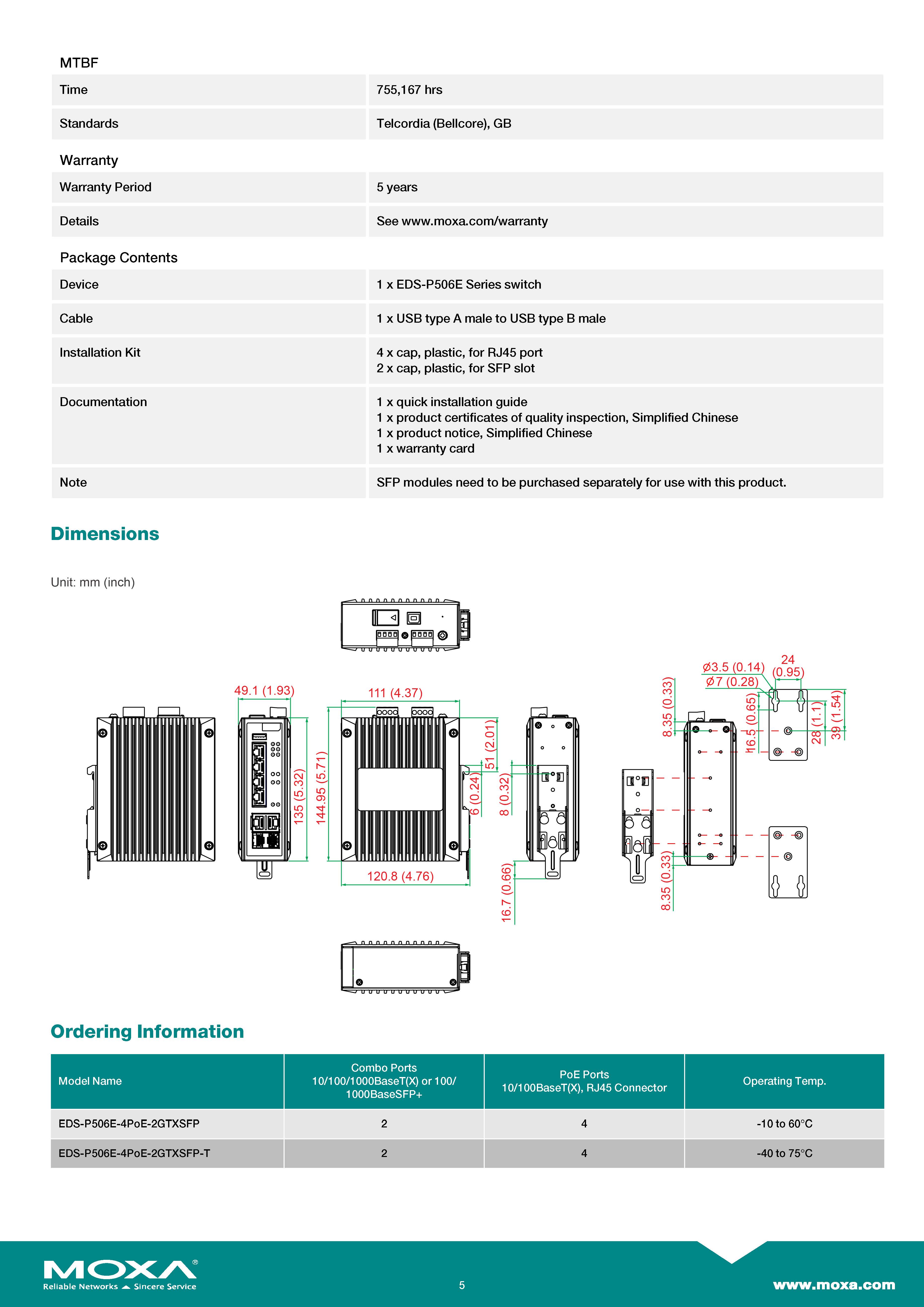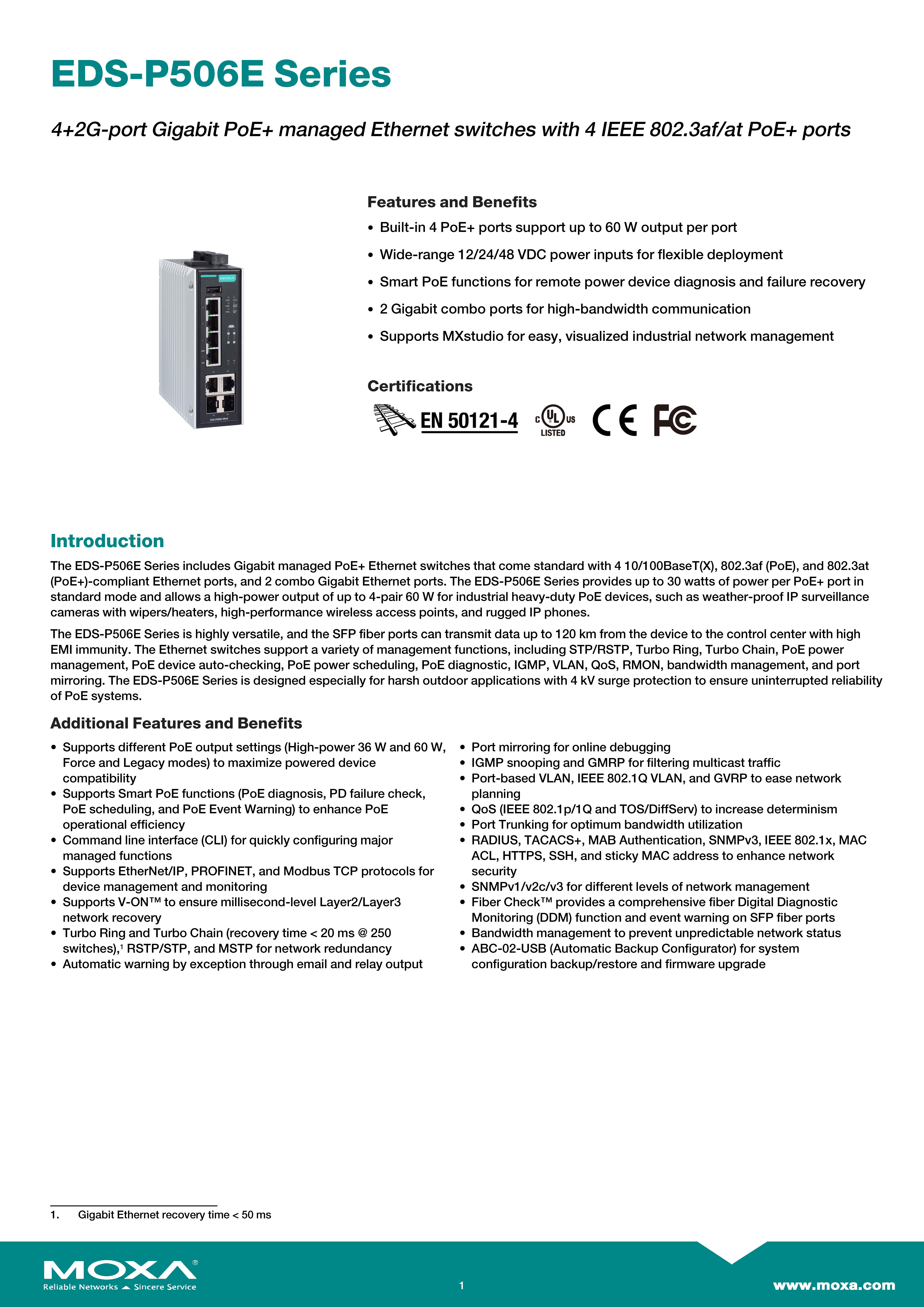MOXA PoE Switches Model : EDS-P506E-4PoE-2GTXSFP Managed Ethernet switch with 4 PoE+/60W 10/100BaseT(X) ports, 2 combo 10/100/1000BaseT(X) or 100/1000BaseSFP ports, dual 12/24/48 VDC power inputs, -10 to 60°C operating temperature ขอราคาพิเศษสำหรับงานโครงการ ติดต่อฝ่ายขาย Line ID : @aimonline ฝ่ายขายโทร: 063-879-9917 ( สินค้ายังไม่รวมภาษีมูลค่าเพิ่ม, ค่าขนส่ง ) เช็คสต๊อกล่าสุดสินค้าก่อนสั่งซื้อ ราคายังไม่รวมค่าติดตั้ง