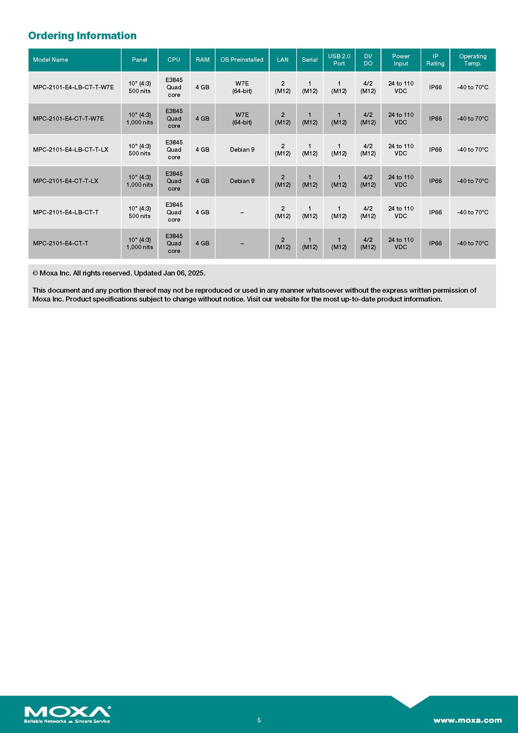 MOXA Panel PCs Model: MPC-2120-E2-T 12-inch panel computer, Intel Atom® E3826 1.46 GHz processor ขอราคาพิเศษสำหรับงานโครงการ ติดต่อฝ่ายขาย Line ID : @aimonline ฝ่ายขายโทร: 063-879-9917 ( สินค้ายังไม่รวมภาษีมูลค่าเพิ่ม, ค่าขนส่ง ) เช็คสต๊อกล่าสุดสินค้าก่อนสั่งซื้อ ราคายังไม่รวมค่าติดตั้ง