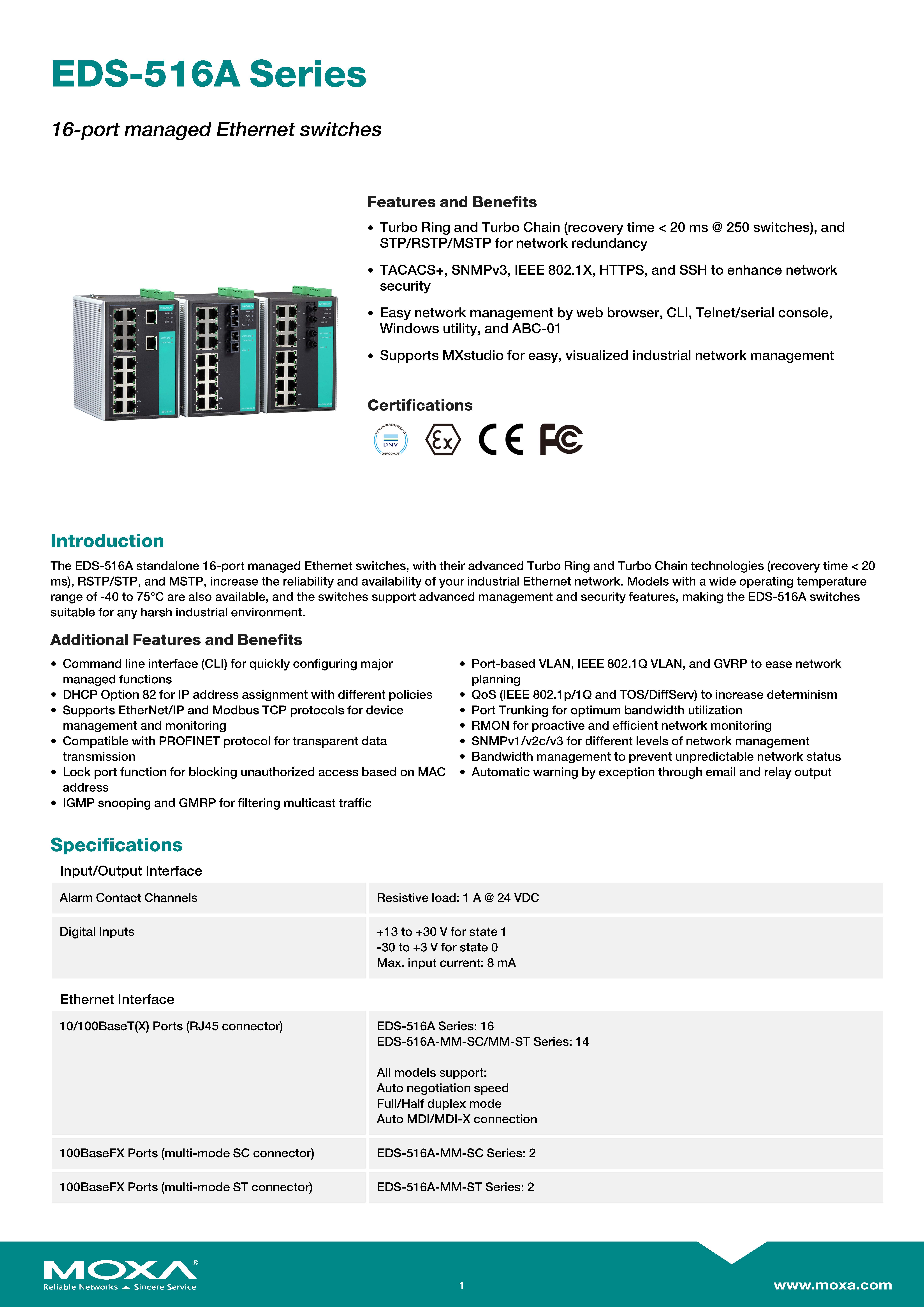 MOXA 16-port managed Ethernet switches Model : EDS-516A The EDS-516A standalone 16-port managed Ethernet switches ขอราคาพิเศษสำหรับงานโครงการ ติดต่อฝ่ายขาย Line ID : @aimonline ฝ่ายขายโทร: 063-879-9917 ( สินค้ายังไม่รวมภาษีมูลค่าเพิ่ม, ค่าขนส่ง ) เช็คสต๊อกล่าสุดสินค้าก่อนสั่งซื้อ ราคายังไม่รวมค่าติดตั้ง