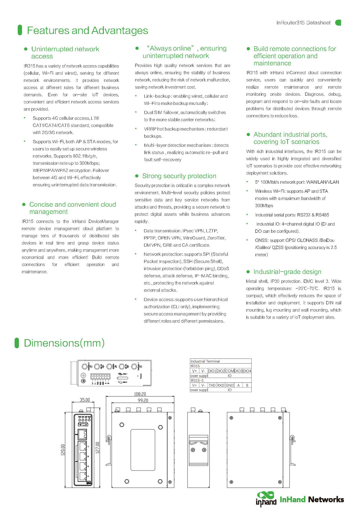 INHAND รุ่น IR315-FQ58-WLAN-S รายละเอียดสินค้า เราเตอร์ 4G LTE พร้อม Wi-Fi ขนาดกะทัดรัดเกรดอุตสาหกรรม (Compact Industrial 4G Wi-Fi Cellular Router) จาก InHand Networks รุ่น IR315-FQ58 มาพร้อมการเชื่อมต่อเครือข่ายความเร็วสูงผ่าน 4G และ Wi-Fi ในตัว โดดเด่นด้วยดีไซน์ขนาดเล็กติดตั้งง่ายประหยัดพื้นที่ พร้อมพอร์ตเชื่อมต่อ Ethernet และ Serial (RS-232/485) อเนกประสงค์ รองรับระบบความปลอดภัย VPN ✅ ขอราคาพิเศษสำหรับงานโครงการติดต่อ Mobile : 063-879-9917 Line ID @aimonline *ราคาสินค้าอาจจะมีการเปลี่ยนแปลงโดยไม่แจ้งให้ทราบล่วงหน้า รบกวนติดต่อฝ่ายขายเพื่ออัพเดทราคา