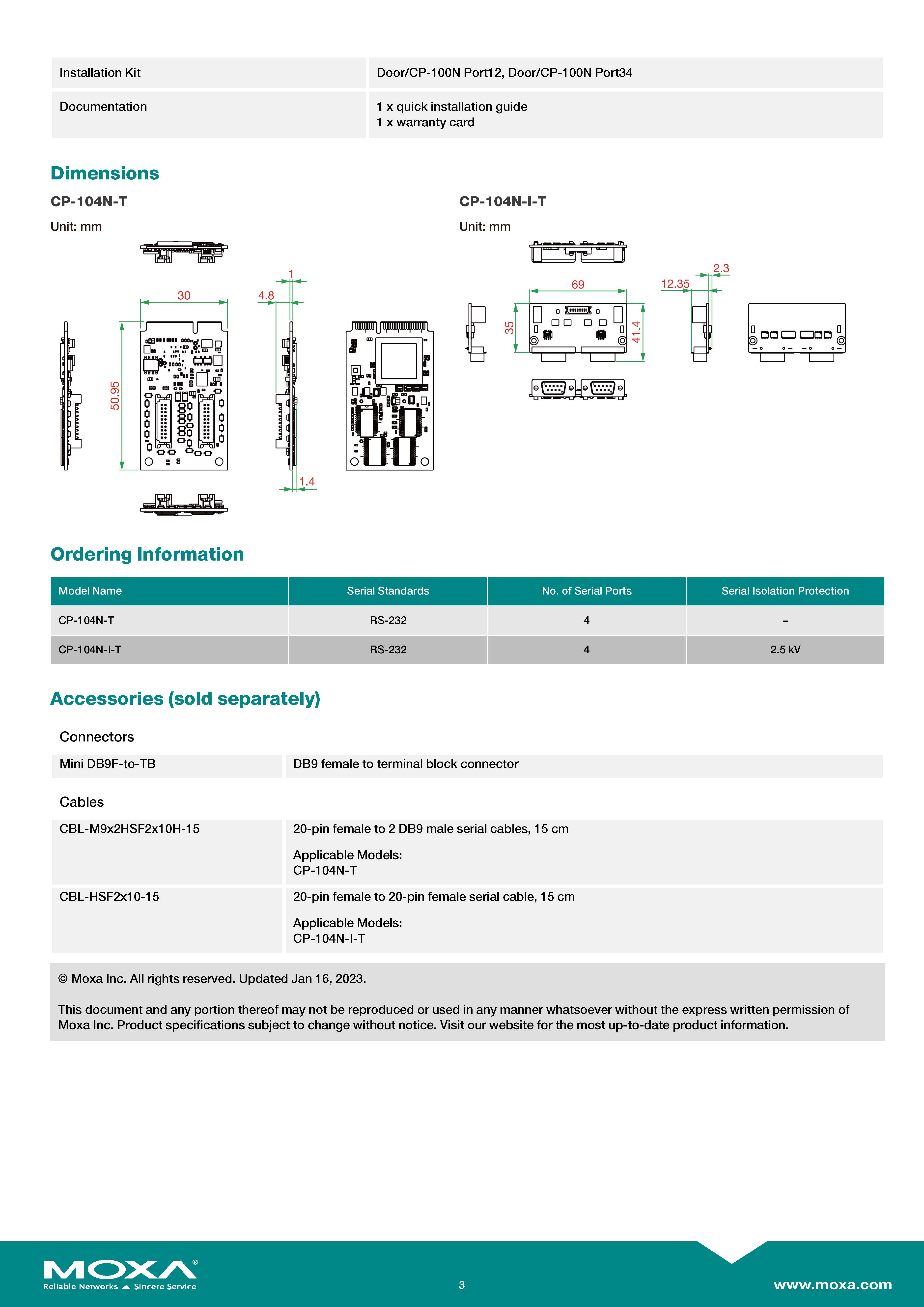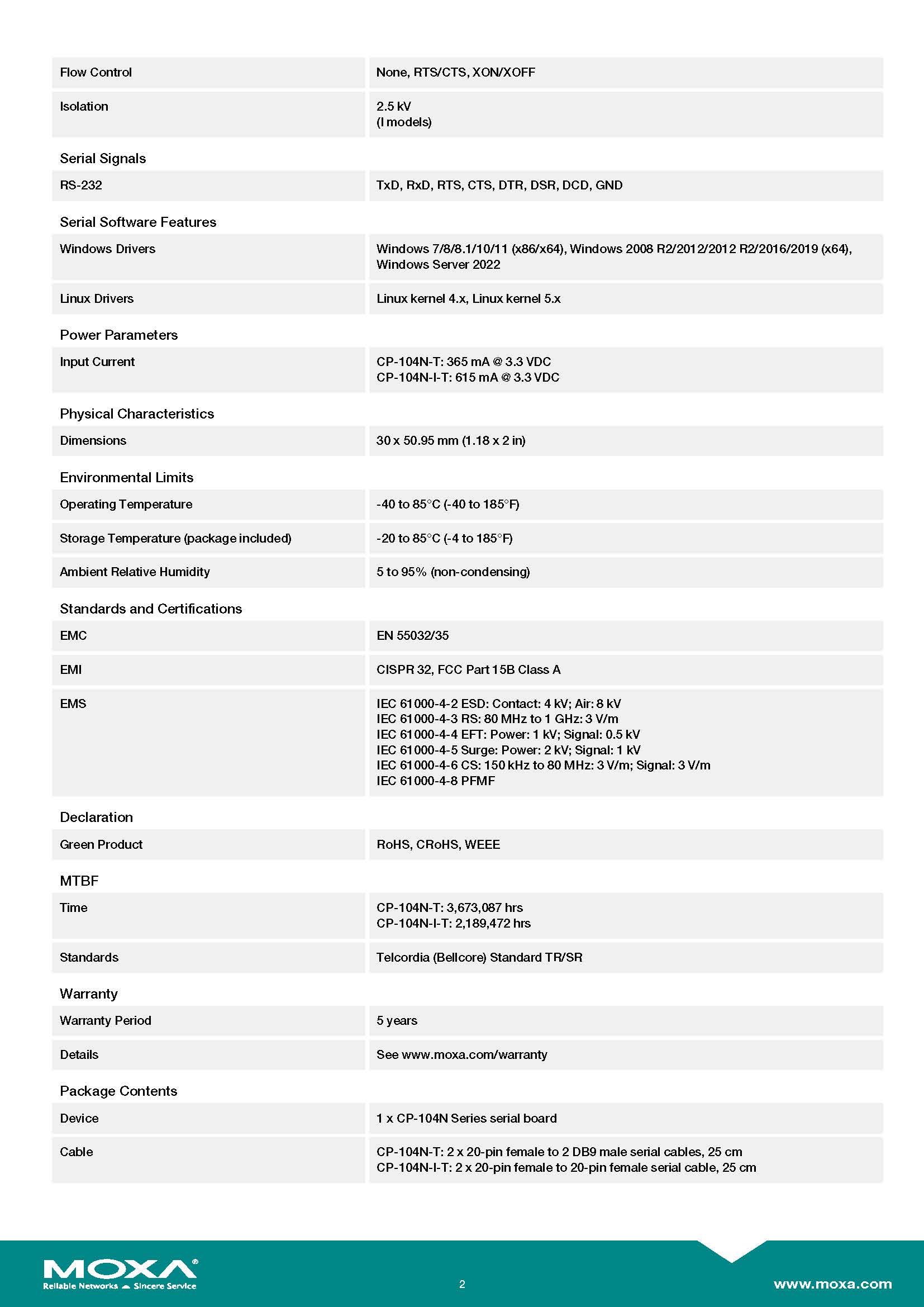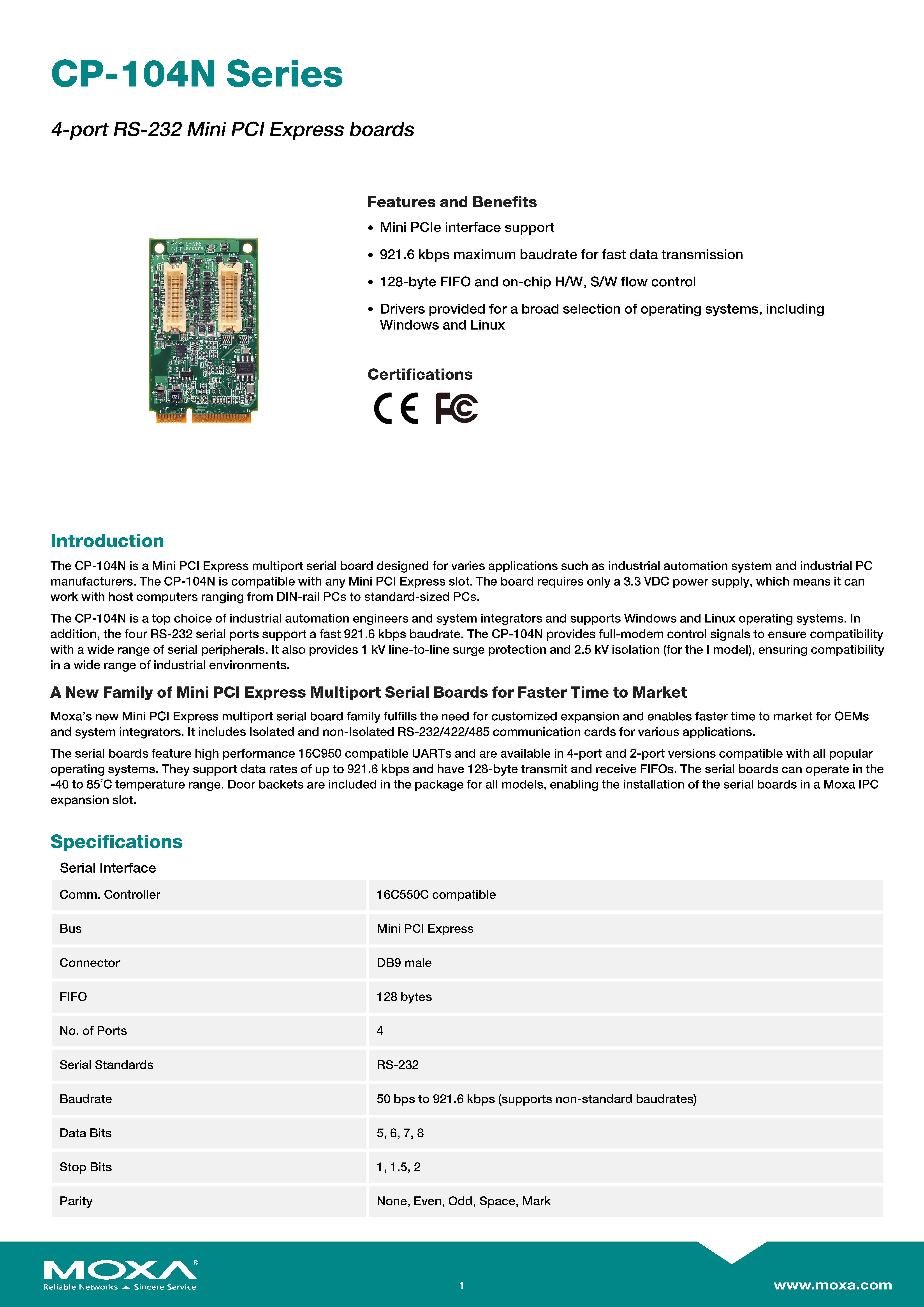 MOXA PCI Serial Cards Model: CP-104N-I-T 4-port RS-232 Mini PCI Express serial board with 2.5 kV capacitive isolation,-40 to 85°C operating temperature ขอราคาพิเศษสำหรับงานโครงการ ติดต่อฝ่ายขาย Line ID : @aimonline ฝ่ายขายโทร: 063-879-9917 ( สินค้ายังไม่รวมภาษีมูลค่าเพิ่ม, ค่าขนส่ง ) เช็คสต๊อกล่าสุดสินค้าก่อนสั่งซื้อ ราคายังไม่รวมค่าติดตั้ง