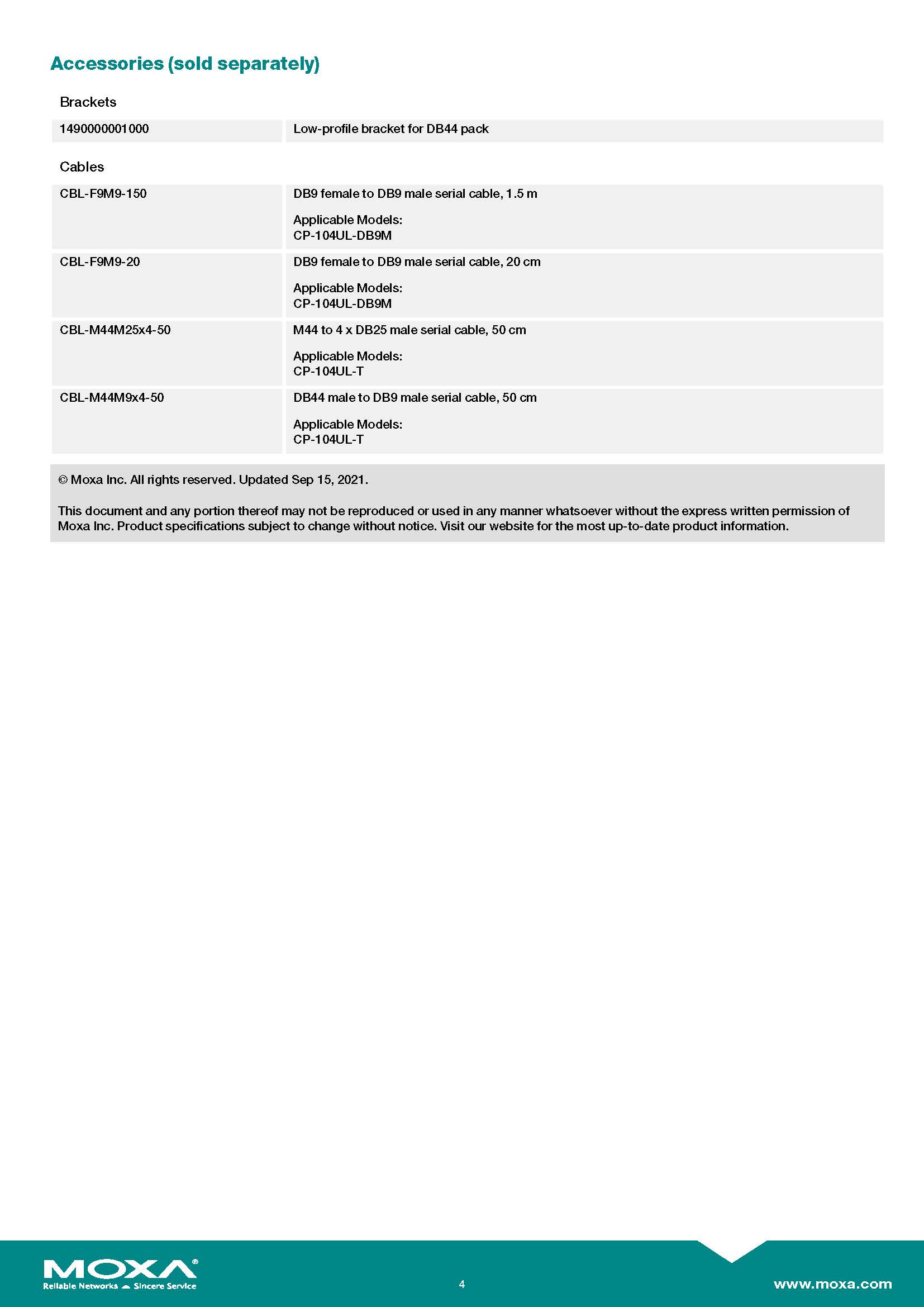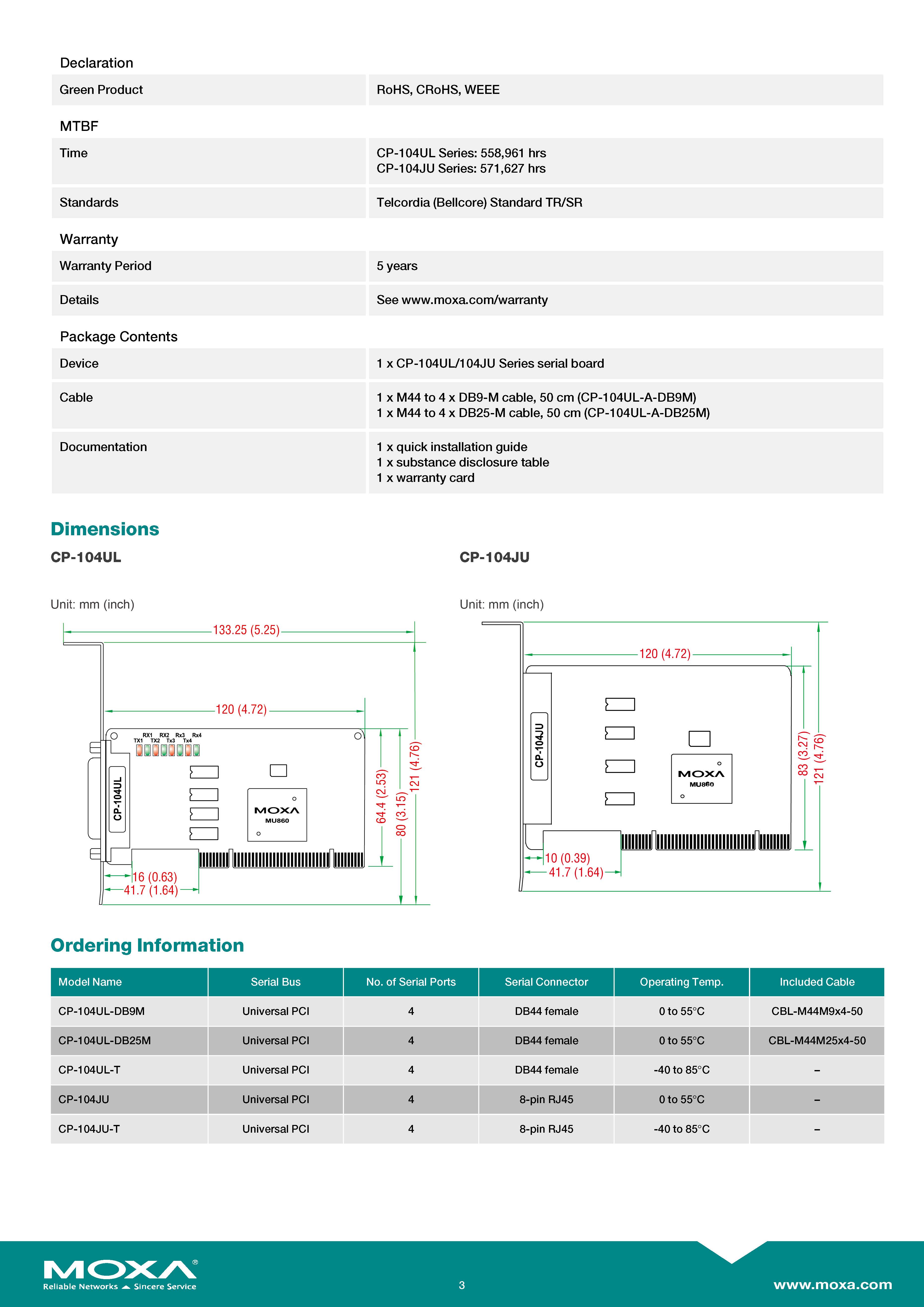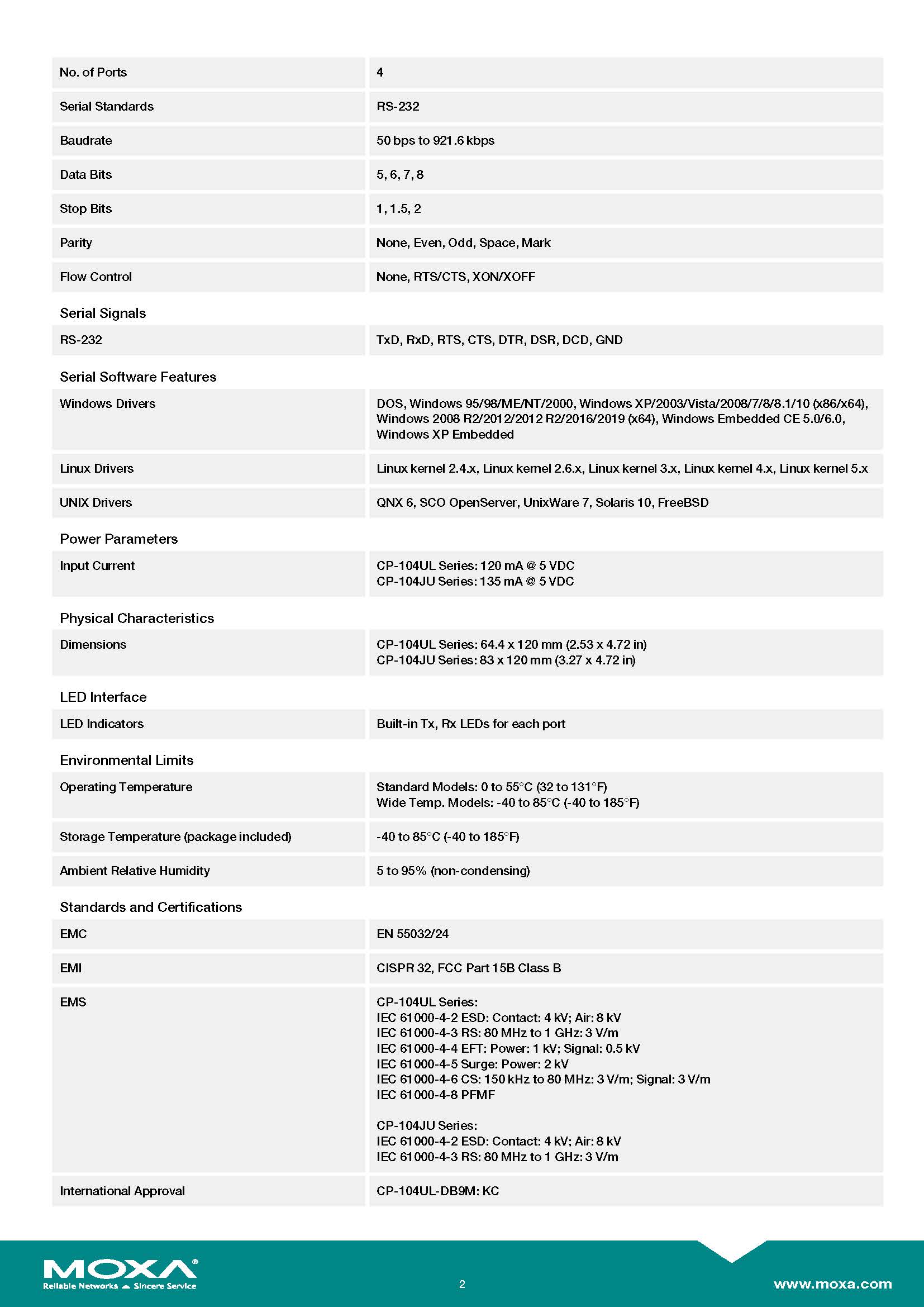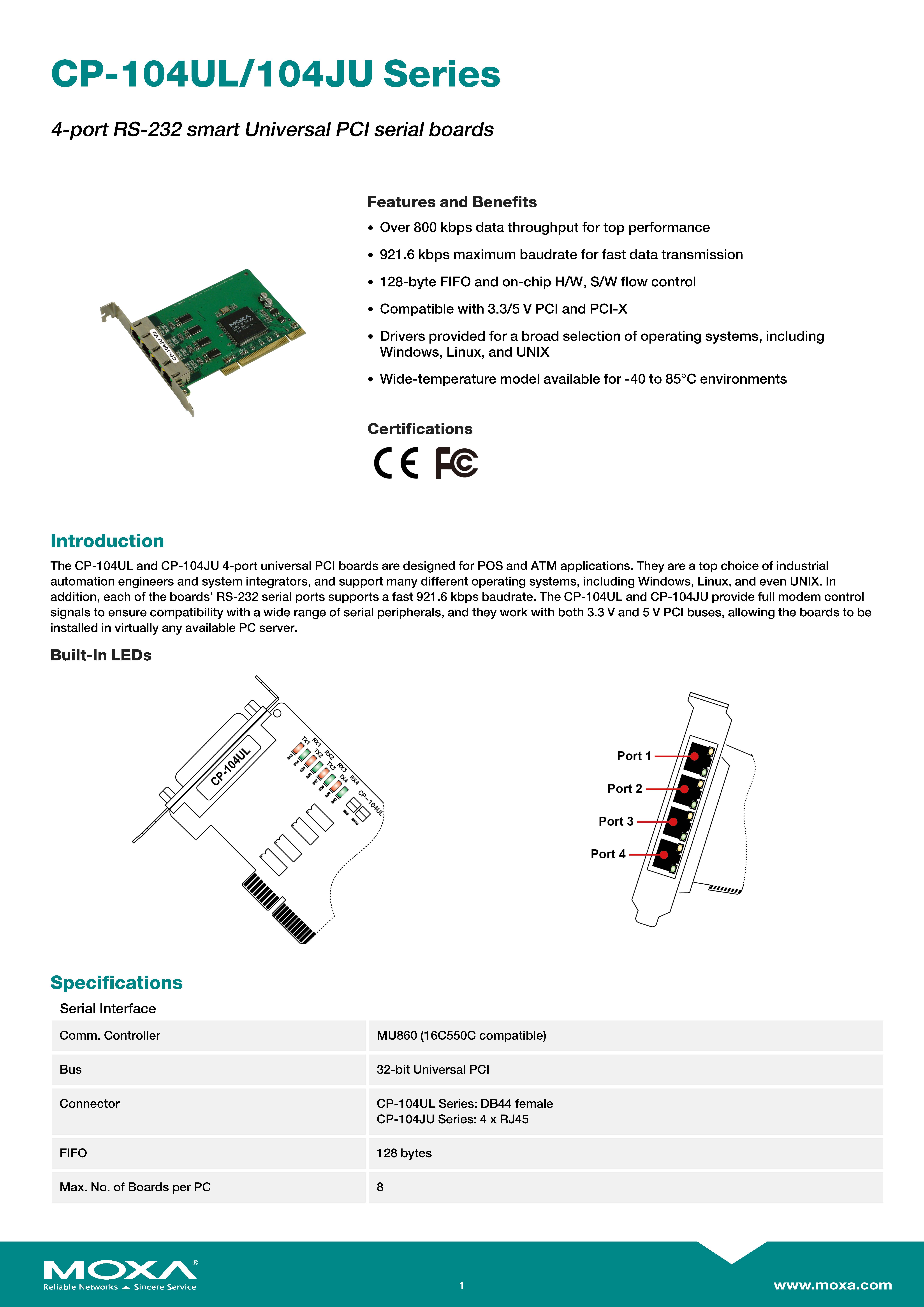 MOXA PCI Serial Cards Model: CP-104JU 4-port RS-232 Universal PCI serial board with RJ45 ports on the board, 0 to 55°C operating temperature ขอราคาพิเศษสำหรับงานโครงการ ติดต่อฝ่ายขาย Line ID : @aimonline ฝ่ายขายโทร: 063-879-9917 ( สินค้ายังไม่รวมภาษีมูลค่าเพิ่ม, ค่าขนส่ง ) เช็คสต๊อกล่าสุดสินค้าก่อนสั่งซื้อ ราคายังไม่รวมค่าติดตั้ง