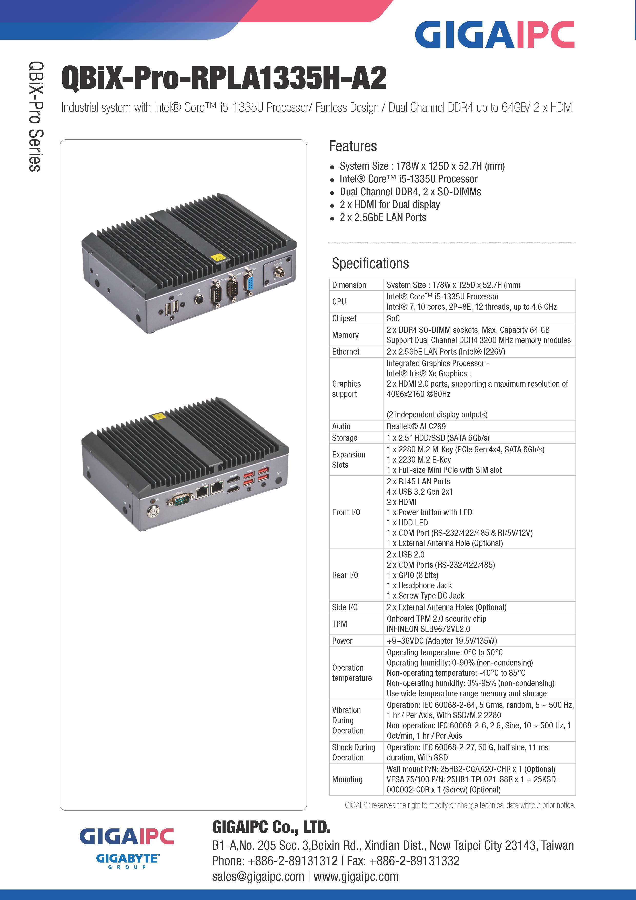 สินค้ายี่ห้อ GIGAIPC รุ่น QBiX-Pro-RPLB1335H-A2 เครื่องคอมพิวเตอร์อุตสาหกรรมแบบไร้พัดลม (Industrial Fanless PC) Industrial PC i5-1335U Processor RAM8/SSD512GB จาก GIGAIPCขับเคลื่อนด้วยขุมพลังประมวลผล Intel Core i5-1335U ประสิทธิภาพสูง โดดเด่นด้วยพอร์ตเชื่อมต่อเครือข่ายความเร็วสูง 2.5GbE LAN จำนวน 2 ช่อง และรองรับการแสดงผลความละเอียด 4K แบบจอคู่ผ่านพอร์ต HDMI ภายใต้ตัวเรือนโลหะกะทัดรัดที่ออกแบบมาเพื่อระบายความร้อนได้อย่างยอดเยี่ยมโดยไม่ต้องใช้พัดลม ตอบโจทย์การเป็นศูนย์กลางประมวลผลสำหรับระบบสมาร์ทรีเทล, คีออสอัจฉริยะ และโครงสร้างพื้นฐานระบบอัตโนมัติได้อย่างเสถียรภาพสูงสุด ✅ ขอราคาพิเศษสำหรับงานโครงการติดต่อ Mobile : 063-879-9917 Line ID @aimonline *ราคาสินค้าอาจจะมีการเปลี่ยนแปลงโดยไม่แจ้งให้ทราบล่วงหน้า กรุณาติดต่อฝ่ายขายเพื่ออัพเดทราคาทราคา