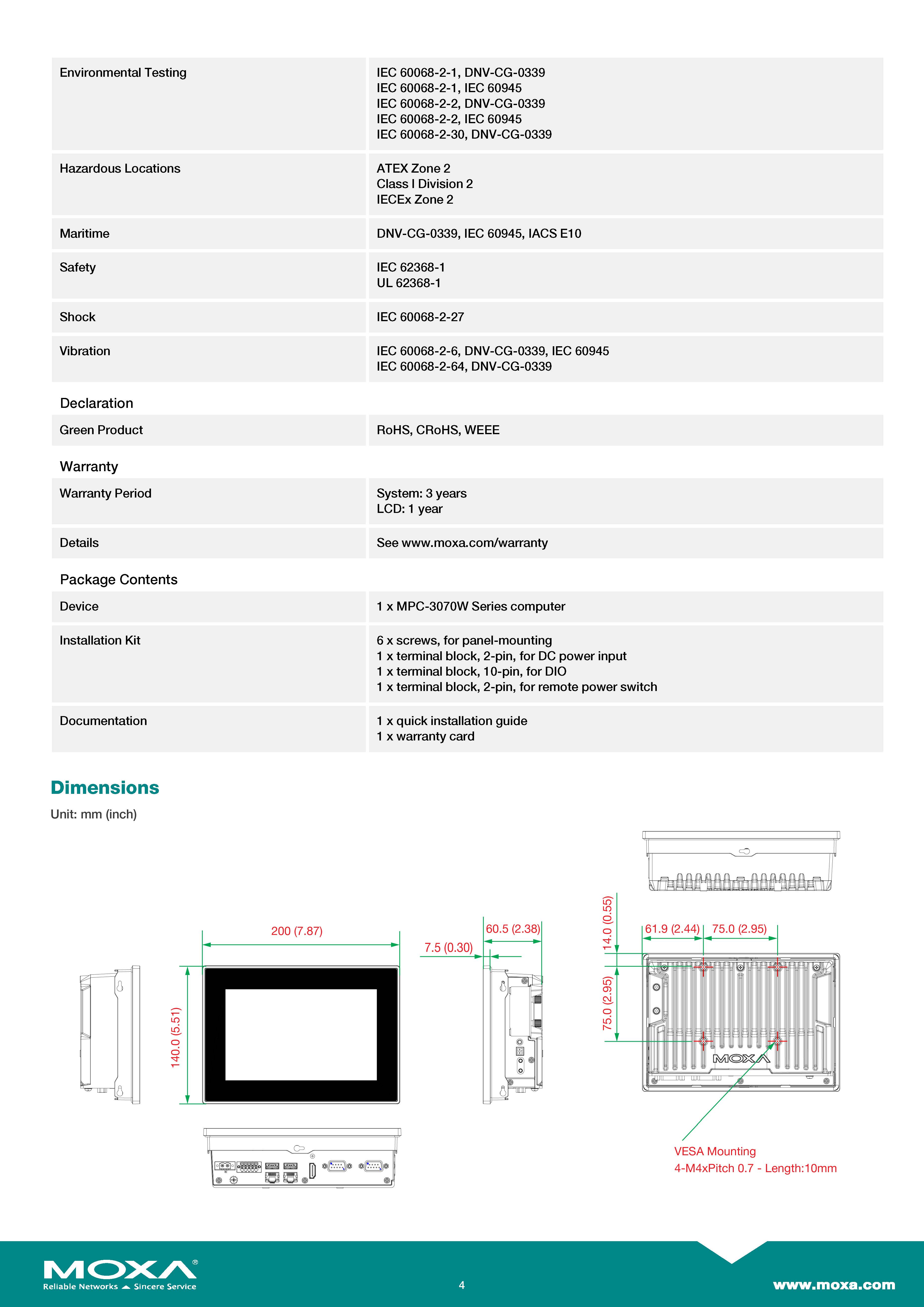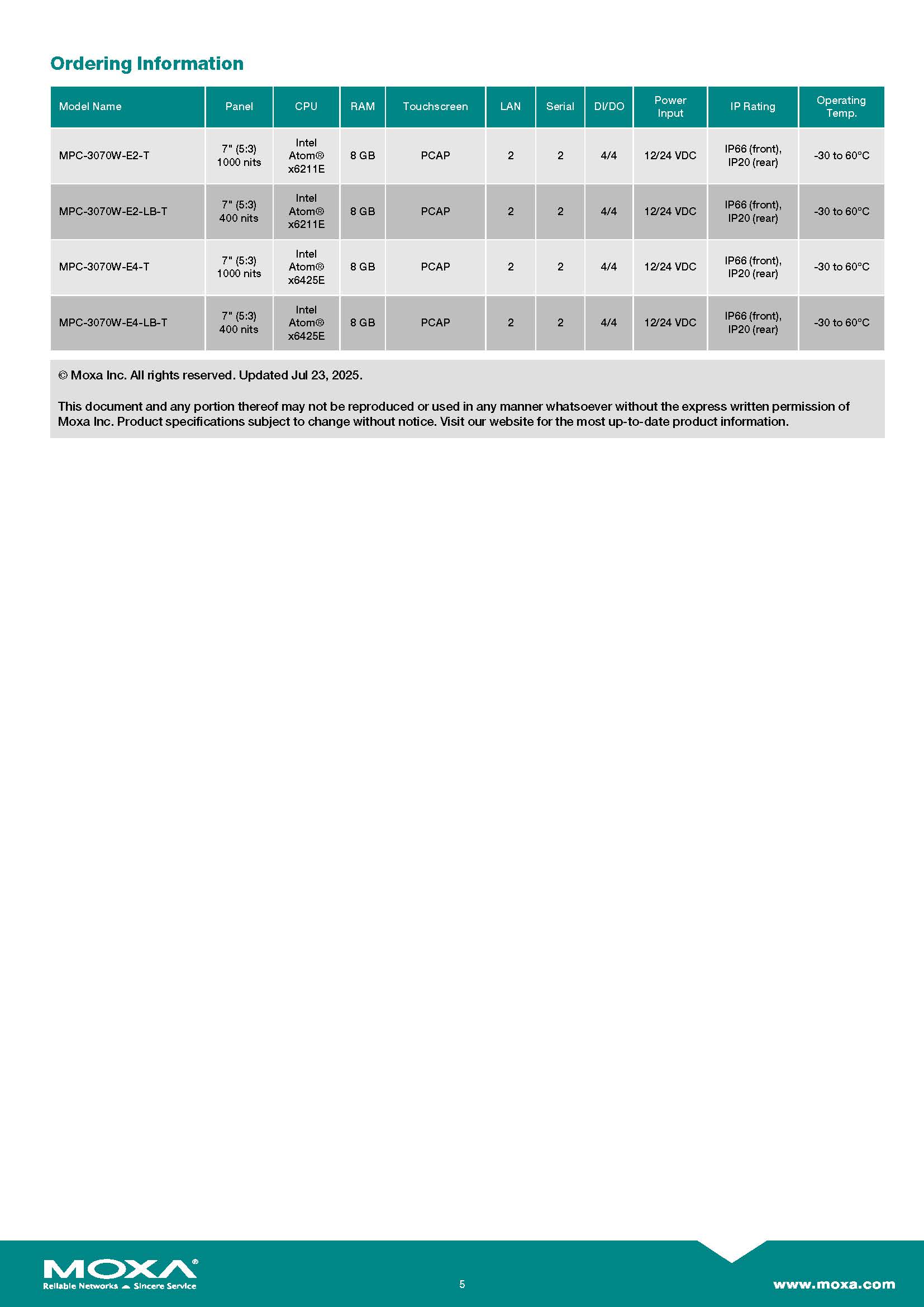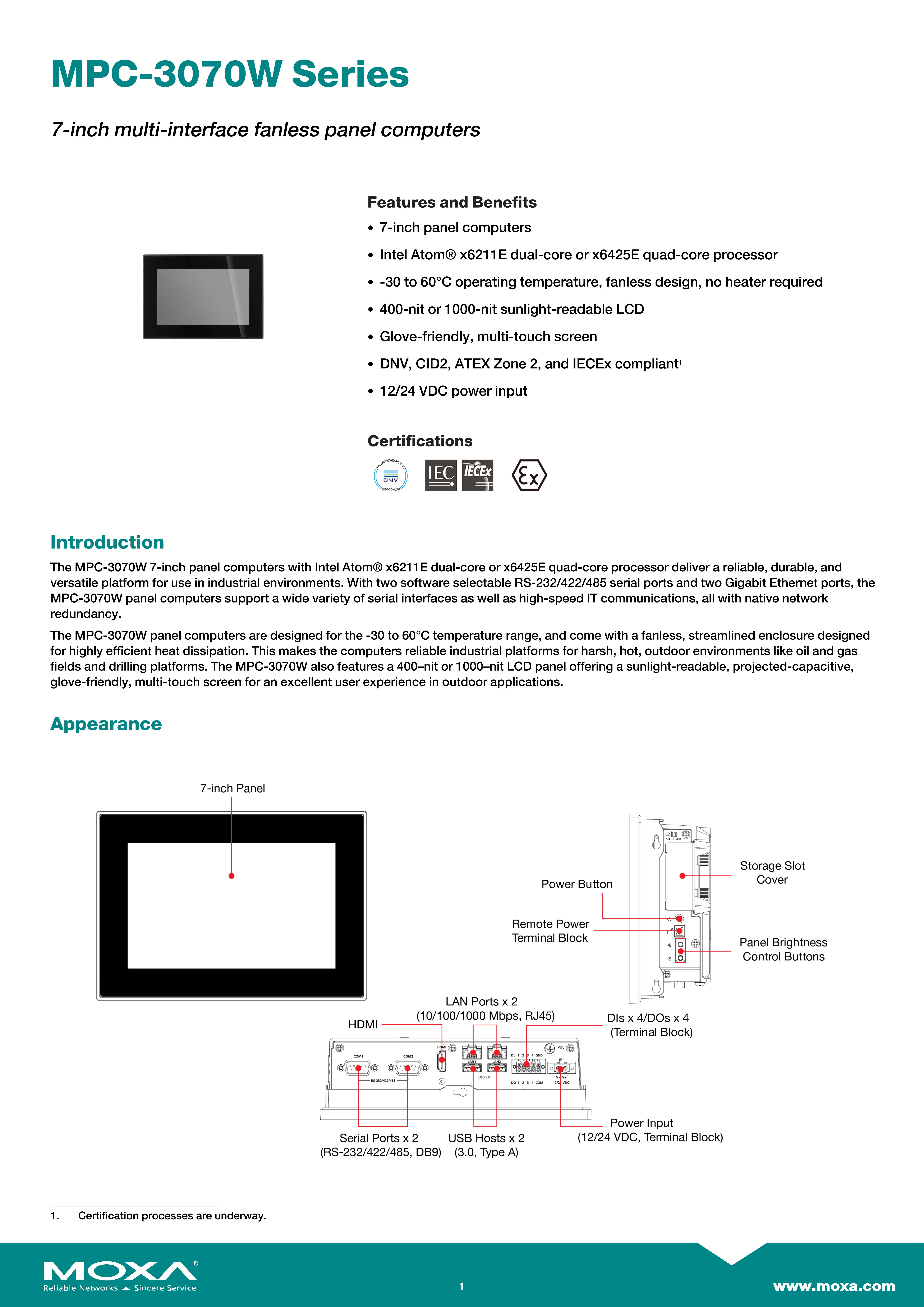 สินค้ายี่ห้อ MOXA รุ่น MPC-3070W-E2-T รายละเอียดสินค้า คอมพิวเตอร์หน้าจอสัมผัสระดับอุตสาหกรรม (Industrial Fanless Panel Computer) ขนาด 7 นิ้ว ขับเคลื่อนด้วยหน่วยประมวลผล Intel Atom x6211E Dual-core พร้อม RAM 8 GB โดดเด่นด้วยหน้าจอสัมผัสแบบ Multi-touch ความสว่างสูงพิเศษ 1000-nits ที่อ่านค่าได้ชัดเจนแม้อยู่กลางแสงแดดจ้าและรองรับการใช้งานขณะสวมถุงมือ มาพร้อมพอร์ต Gigabit LAN 2 ช่อง, พอร์ตซีเรียล 2 ช่อง และ USB 3.0 ภายใต้ตัวเรือนดีไซน์ไร้พัดลมมาตรฐานกันน้ำกันฝุ่น IP66 (ด้านหน้า) ทนทานต่ออุณหภูมิสุดขั้วตั้งแต่ -30 ถึง 60°C (-T) และผ่านมาตรฐานความปลอดภัยระดับสากลทั้ง ATEX Zone 2, CID2 และ DNV ตอบโจทย์การเป็นหน้าจอสั่งการ (HMI) สำหรับสภาพแวดล้อมสมบุกสมบัน งานแท่นขุดเจาะปิโตรเคมี และอุตสาหกรรมเดินเรือได้อย่างสมบูรณ์แบบ ✅ ขอราคาพิเศษสำหรับงานโครงการติดต่อ Mobile : 063-879-9917 Line ID @aimonline *ราคาสินค้าอาจจะมีการเปลี่ยนแปลงโดยไม่แจ้งให้ทราบล่วงหน้า รบกวนติดต่อฝ่ายขายเพื่ออัพเดทราคา
