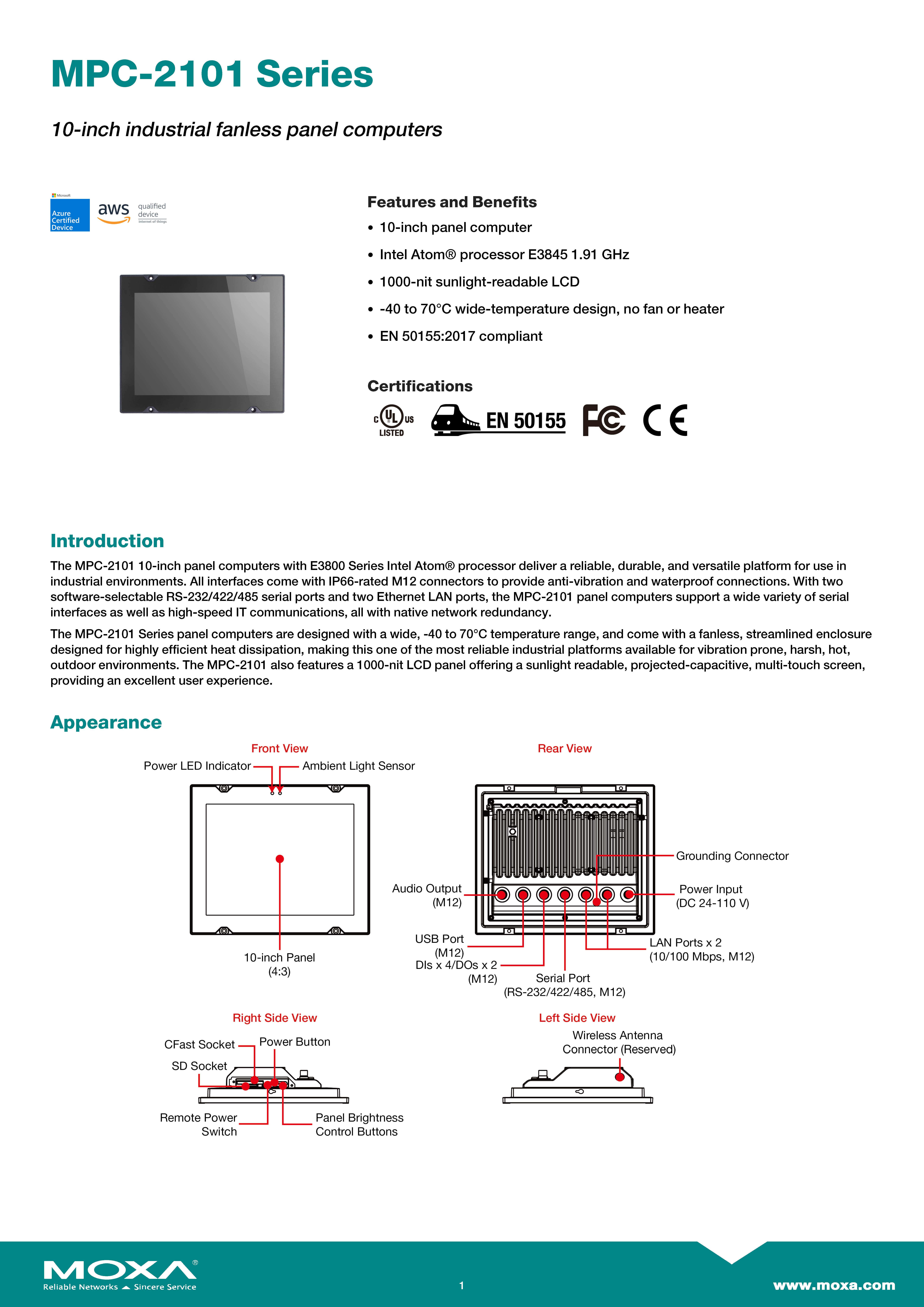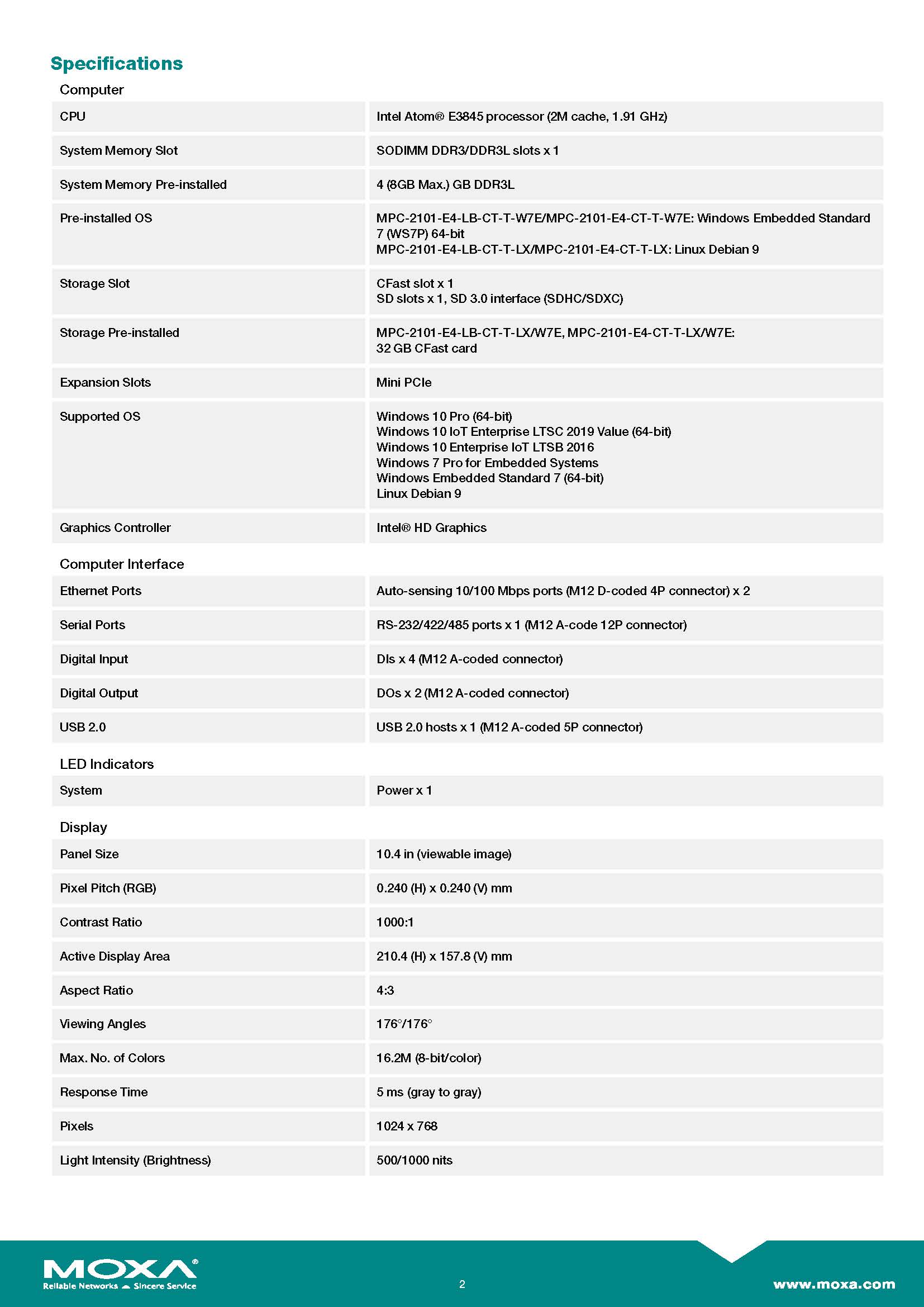 สินค้ายี่ห้อ MOXA รุ่น MPC-2101-E4-LB-CT-T-LX รายละเอียดสินค้า คอมพิวเตอร์หน้าจอสัมผัสระดับอุตสาหกรรม (Industrial Fanless Panel Computer) ขนาด 10.1 นิ้ว ขับเคลื่อนด้วยขุมพลัง Intel Atom Quad-core พร้อมระบบปฏิบัติการ Linux ในตัว โดดเด่นด้วยหน้าจอสัมผัสแบบ Multi-touch (PCAP) ที่ตอบสนองได้อย่างแม่นยำ มาพร้อมพอร์ตเชื่อมต่อ Gigabit LAN 2 ช่อง, พอร์ตซีเรียล 2 ช่อง และพอร์ต I/O ดิจิทัล ภายใต้ตัวเรือนไร้พัดลมมาตรฐานกันน้ำกันฝุ่น IP66 (ด้านหน้า) ที่ผ่านการเคลือบแผงวงจรเพื่อป้องกันความชื้นและการกัดกร่อนขั้นสูง (Conformal Coating) ทนทานต่ออุณหภูมิสุดขั้วตั้งแต่ -40 ถึง 70°C (-T) ตอบโจทย์การเป็นหน้าจอสั่งการ (HMI) ที่อึดถึกทนสำหรับระบบอัตโนมัติในโรงงานและสภาพแวดล้อมที่เปียกชื้นหรือเต็มไปด้วยสารเคมีได้อย่างมีเสถียรภาพสูงสุด ✅ ขอราคาพิเศษสำหรับงานโครงการติดต่อ Mobile : 063-879-9917 Line ID @aimonline *ราคาสินค้าอาจจะมีการเปลี่ยนแปลงโดยไม่แจ้งให้ทราบล่วงหน้า รบกวนติดต่อฝ่ายขายเพื่ออัพเดทราคา
