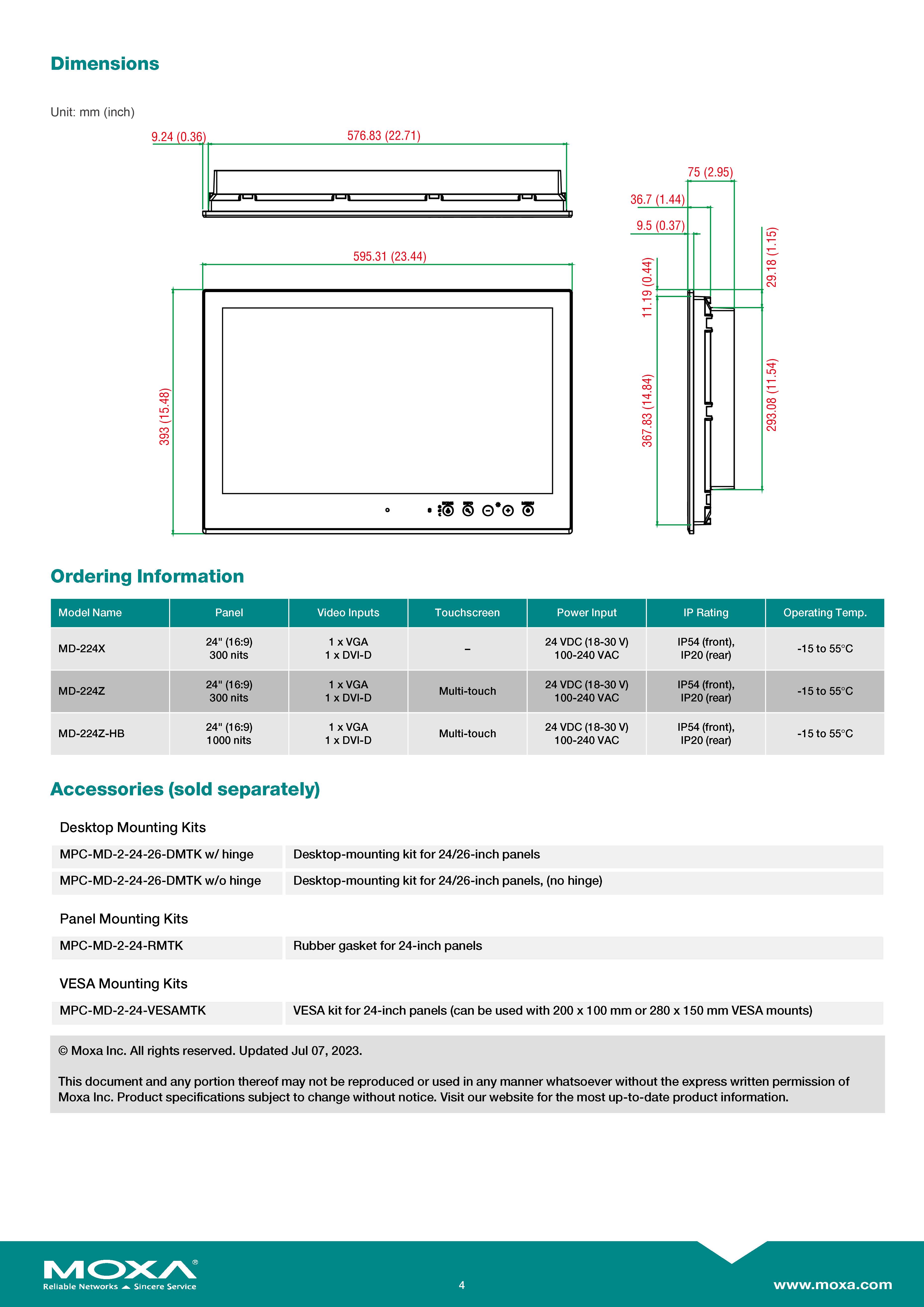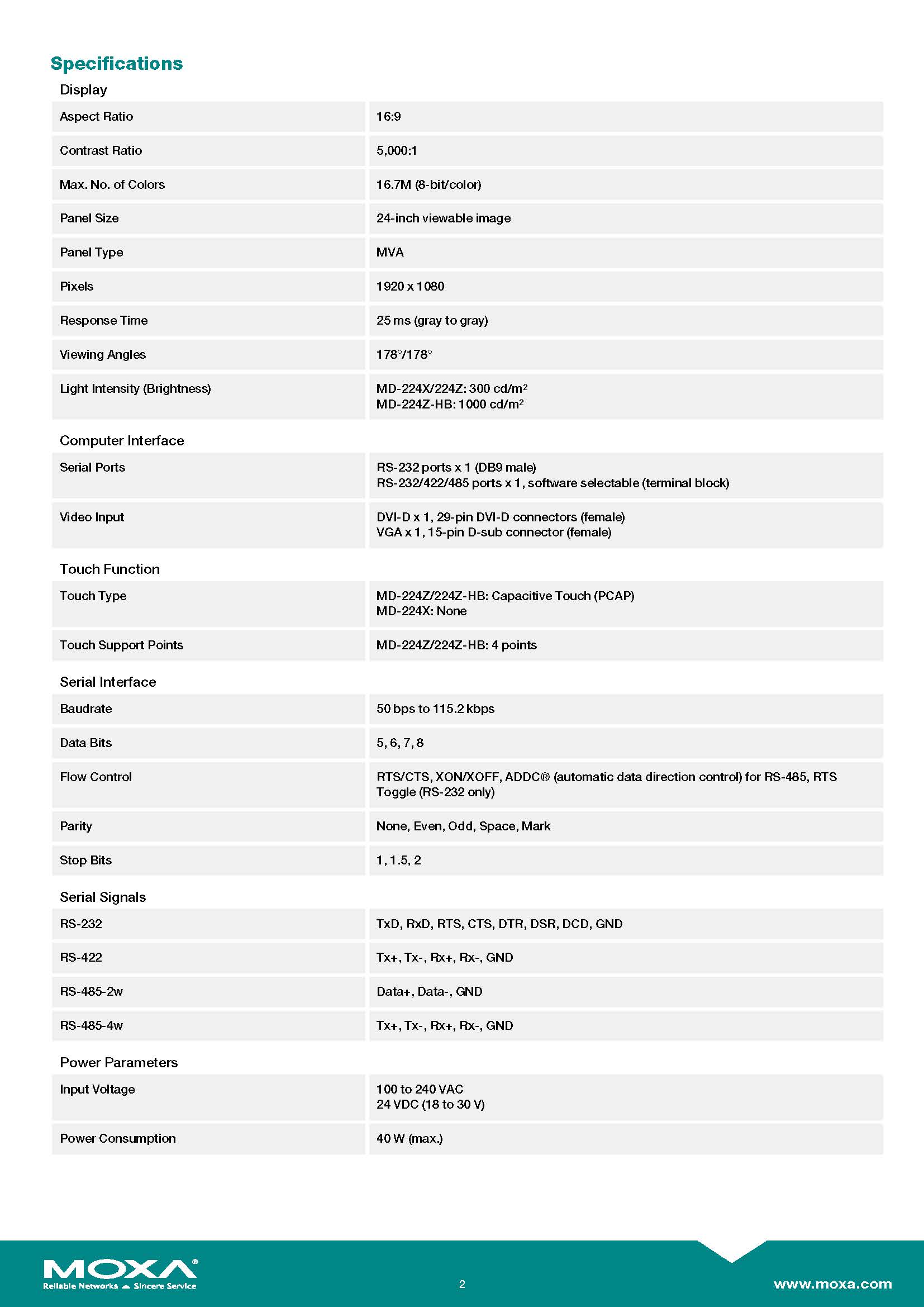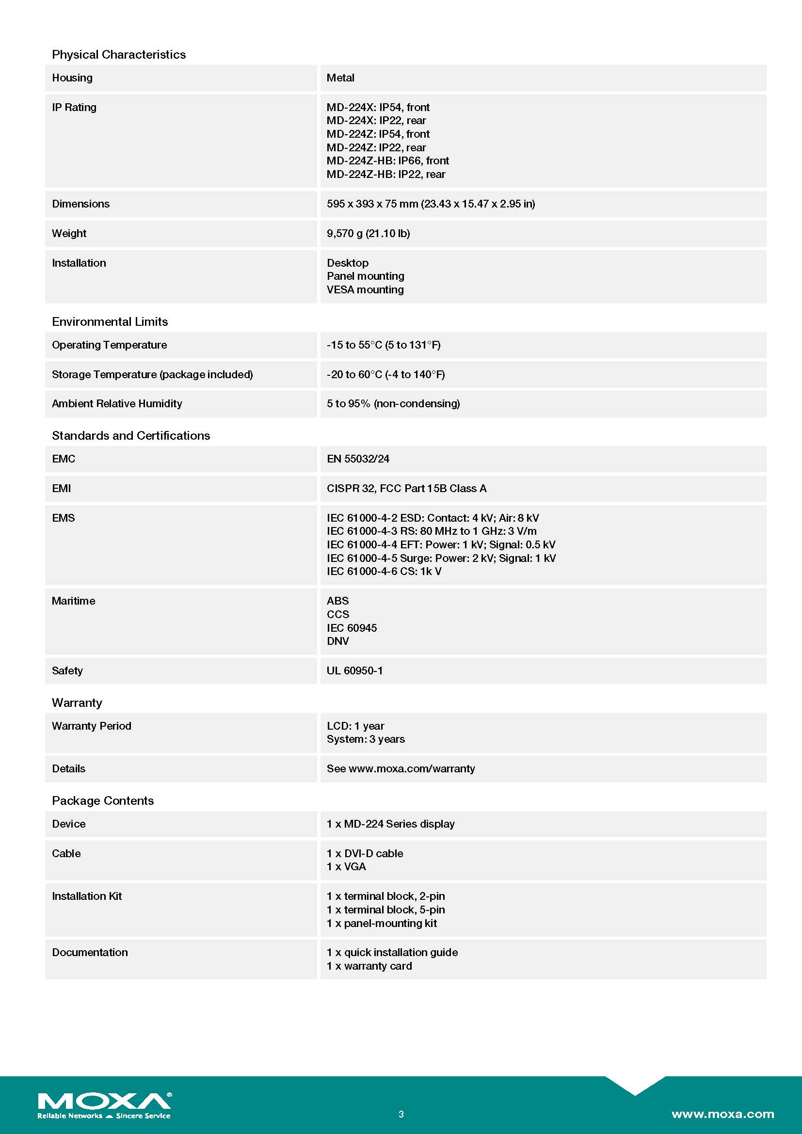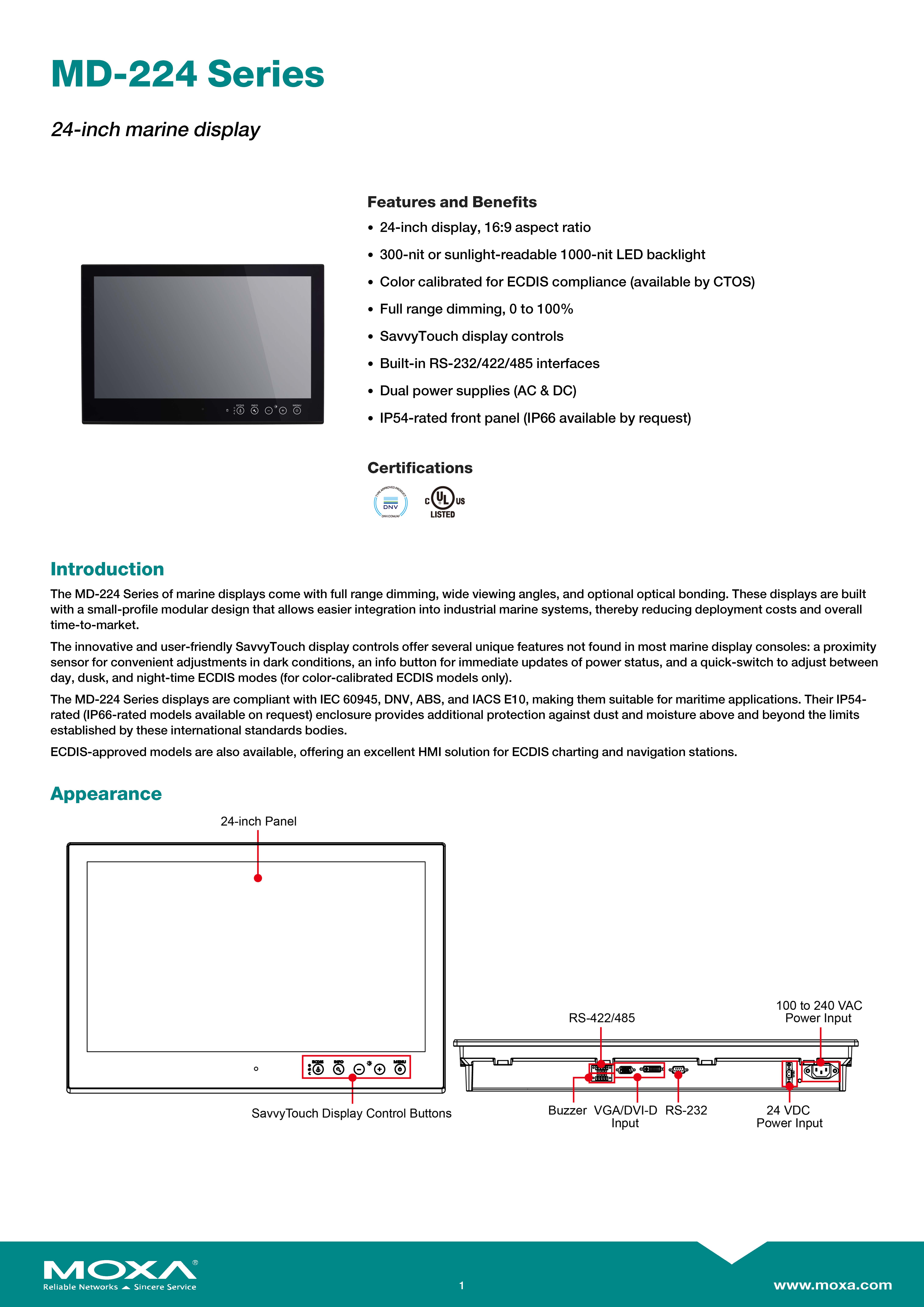 สินค้ายี่ห้อ MOXA รุ่น MD-224X รายละเอียดสินค้า หน้าจอแสดงผลระดับอุตสาหกรรมสำหรับงานเดินเรือ (Marine Display) ขนาด 24 นิ้ว แบบจอกว้าง (16:9) ความละเอียด Full HD โดดเด่นด้วยหน้าจอ MVA ความสว่าง 300-nits พร้อมปุ่มควบคุมอัจฉริยะ SavvyTouch™ ที่ช่วยให้ปรับลดแสงสว่างหรือสลับโหมดกลางวันและกลางคืน (Day/Dusk/Night) ได้อย่างรวดเร็ว รองรับการรับสัญญาณภาพทั้ง VGA และ DVI-D พร้อมพอร์ตซีเรียลสำหรับควบคุมระบบ มาพร้อมระบบไฟแบบคู่ (Dual Power) ที่รองรับไฟเข้าทั้ง 100-240 VAC และ 24 VDC ภายใต้ตัวเรือนอลูมิเนียมทนทานมาตรฐานกันน้ำกันฝุ่น IP54 (ด้านหน้า) และผ่านการรับรองมาตรฐานอุตสาหกรรมเดินเรือระดับสากลสูงสุดทั้ง IEC 60945, DNV, ABS และ IACS E10 ตอบโจทย์การเป็นจอมอนิเตอร์สำหรับสะพานเดินเรือ (Bridge) หรือห้องควบคุมในเรือขนส่งและแท่นขุดเจาะนอกชายฝั่งได้อย่างมีเสถียรภาพสูงสุด ✅ ขอราคาพิเศษสำหรับงานโครงการติดต่อ Mobile : 063-879-9917 Line ID @aimonline *ราคาสินค้าอาจจะมีการเปลี่ยนแปลงโดยไม่แจ้งให้ทราบล่วงหน้า รบกวนติดต่อฝ่ายขายเพื่ออัพเดทราคา